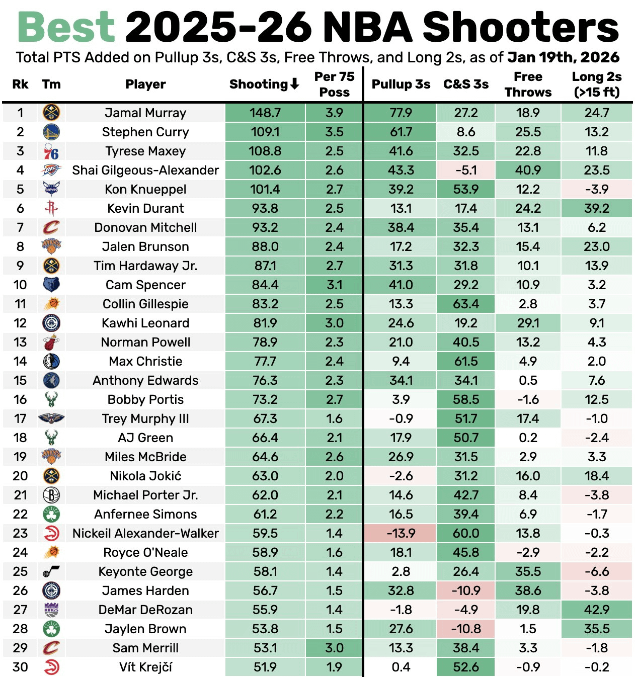 The Nuggets have 3 top 30 shooters, including The Blue Arrow at the top.