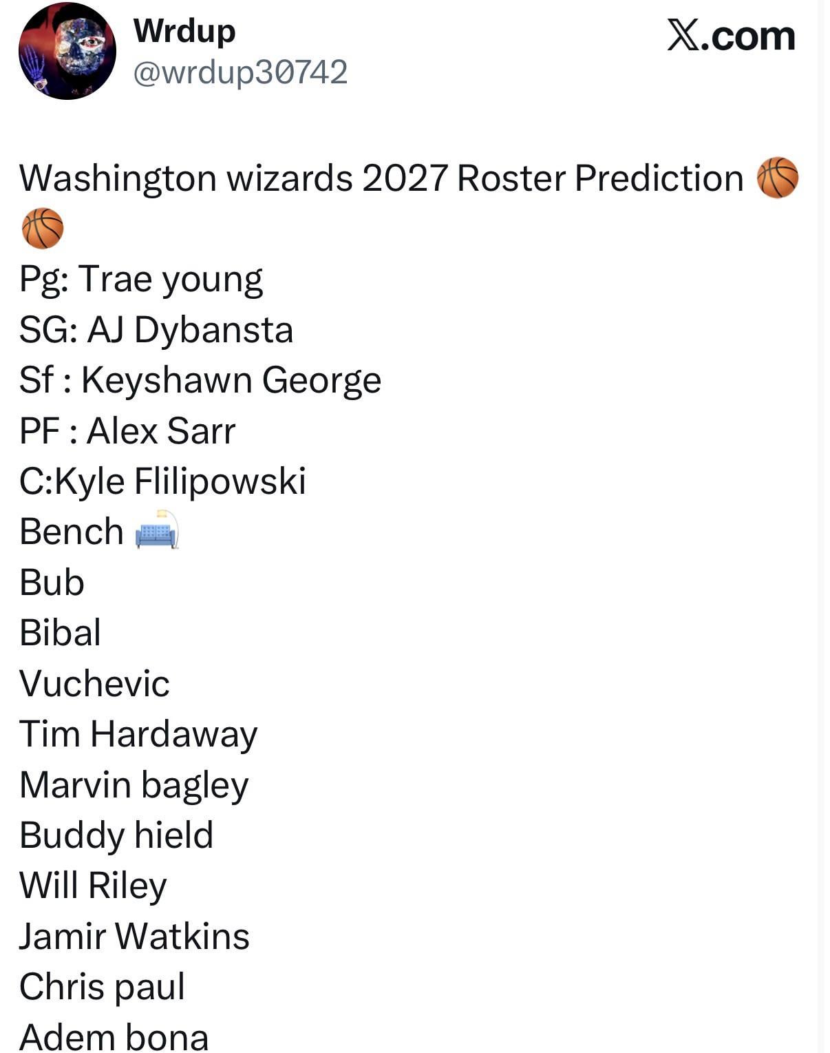 Wizards 2027 roster predictions 13 comments Am I missing the joke? How many wins does this roster get for us in 2027 king? Where did Filipowski and Bona come from lool RIP defense you forgot bronnie james Where’d Tre Johnson Bibal…. The frenchman This isn;t funny 😡😡😡😡 Uhhhhh…whut??!? Buddy Hield and Chris Paul are deeeep in the bench. 💆🏼♂️ 🤣🤣🤣 0/10 ragebait Quality shitpost 🫡 Leave a ReplyYou must be logged in to post a comment.