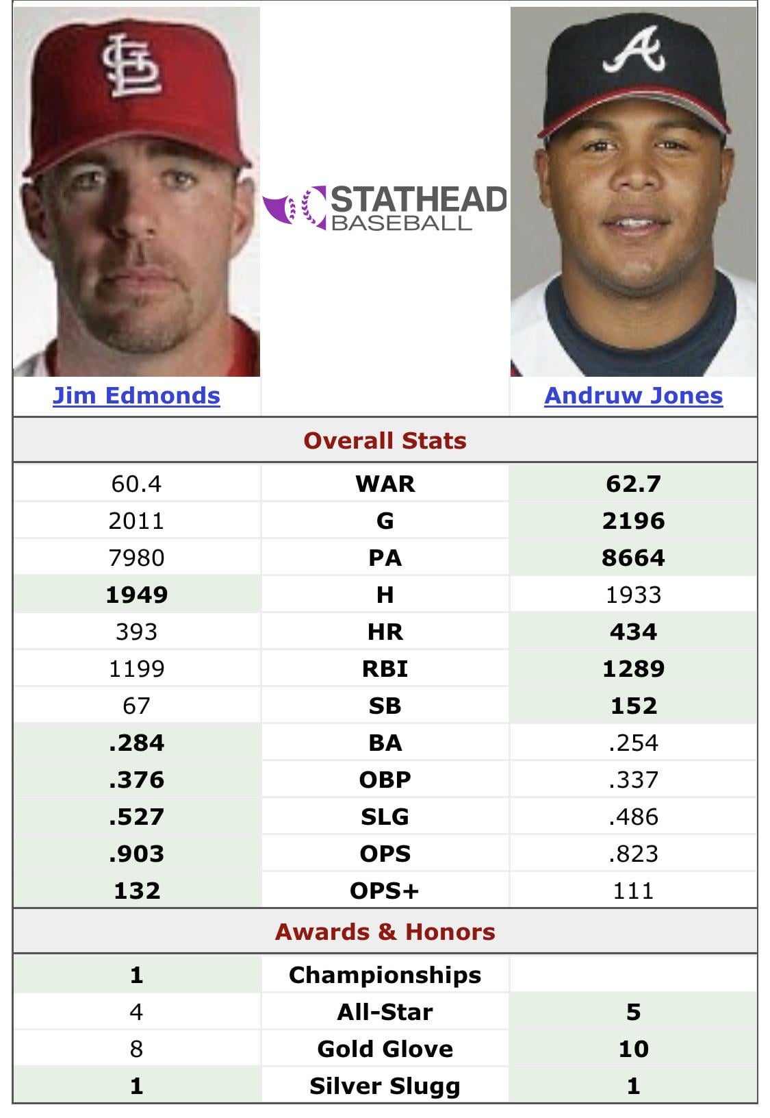 Then there is the vibes. Edmonds was looked at as a premier fielder, but Jones was looked at as THE fielder of his generation. It doesnt really matter that he became a complete liability in the field by the time he turned 30. I think most people dont realize how young Jones was in the twilight of his career. Its just kinda seen as the natural end of any great career, but most people dont realize it happened 5-7 years before most HOF careers tail off.
