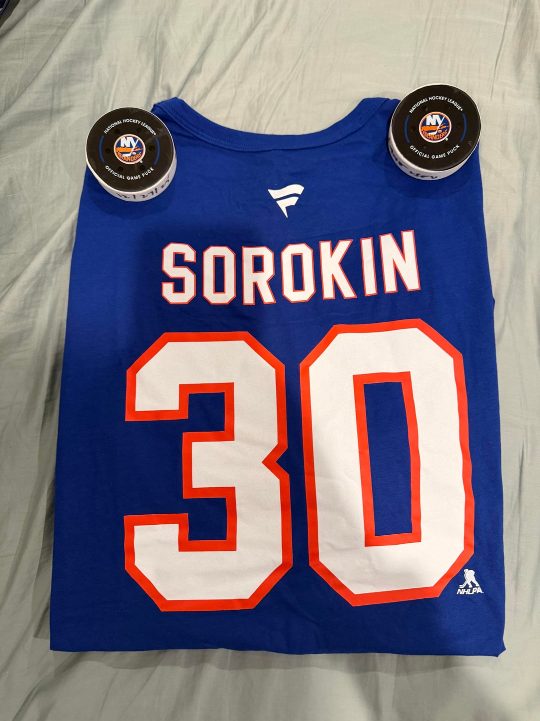 The Sorokin shirt is from Isles Lab and the pucks are both game used from Big Save Dave's shutout on 12/27 against the Rangers and Duclair's hat trick + Soroking's record breaking shutout on 1/6 against the Devils.