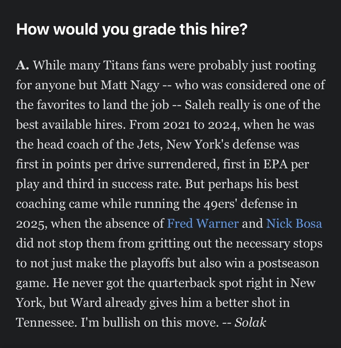 I believe the Niners finished 27th in defense this year based on advanced stats. Maybe that’s a good mark given all the injuries but let’s not pretend that was a good unit.