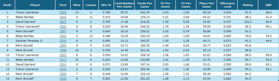 I was tinkering with Pro Football Reference and pulled Jaguars QB stats into Excel. Made my own “Contribution per game” (basically an adjusted fantasy score) and ranked QBs by that.