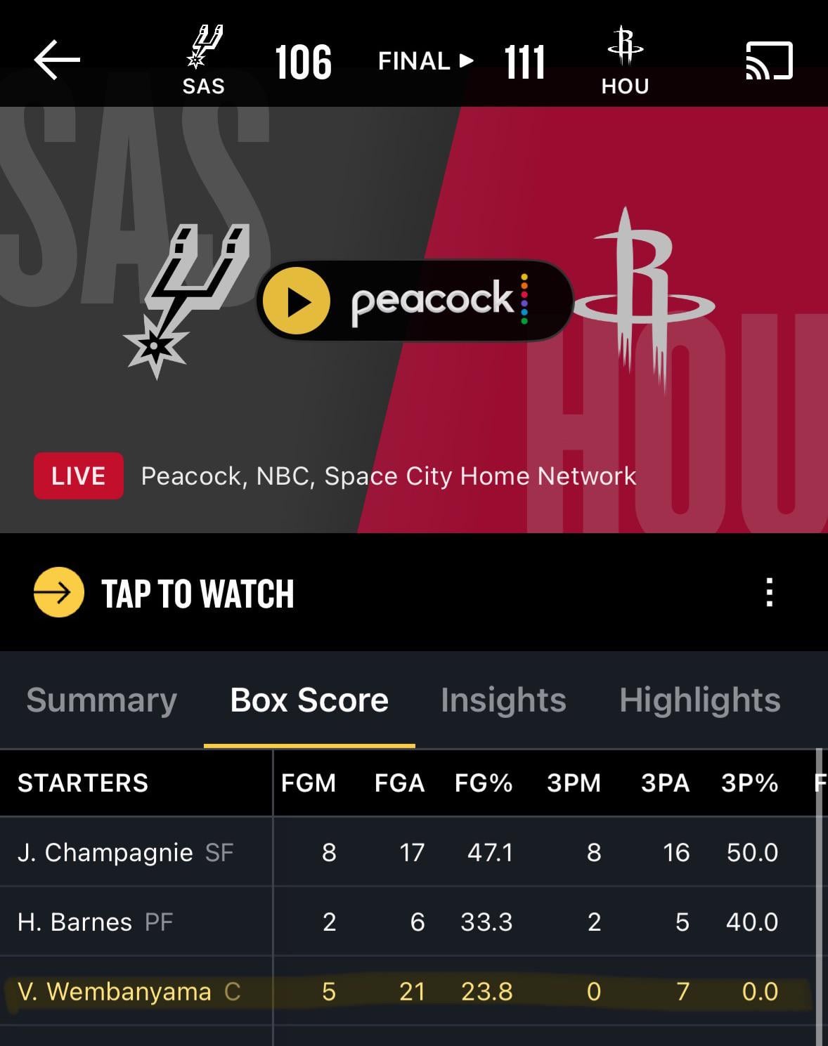 i have never seen a “superstar” perform as bad than wemby tonight. he was nowhere to be found, got pocketed by alperen sengun. “ethical ball” he claims to play, but spent more time flopping and on the ground than getting stops and buckets. incredible win from the rockets tonight, statement win for sure. reed sheppard was phenomenal, sengun phenomenal game as well.