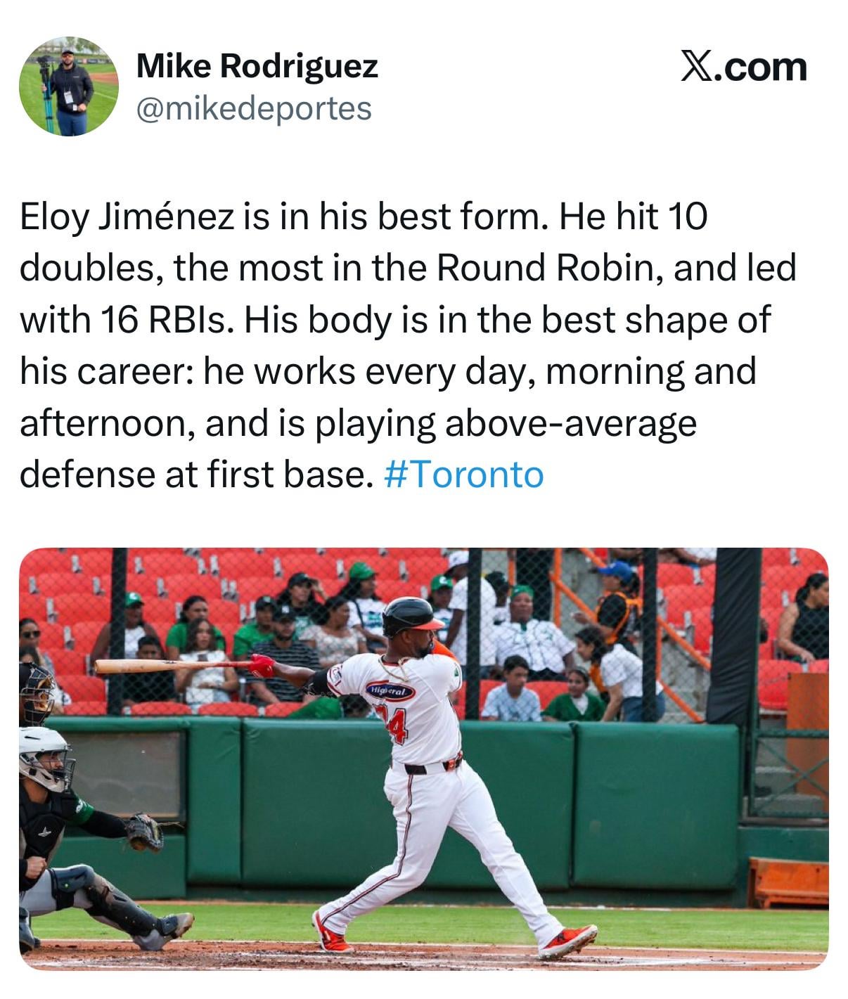 [Rodriguez] Eloy Jiménez is in his best form. He hit 10 doubles, the most in the Round Robin, and led with 16 RBIs. His body is in the best shape of his career: he works every day, morning and afternoon, and is playing above-average defense at first base. #Toronto