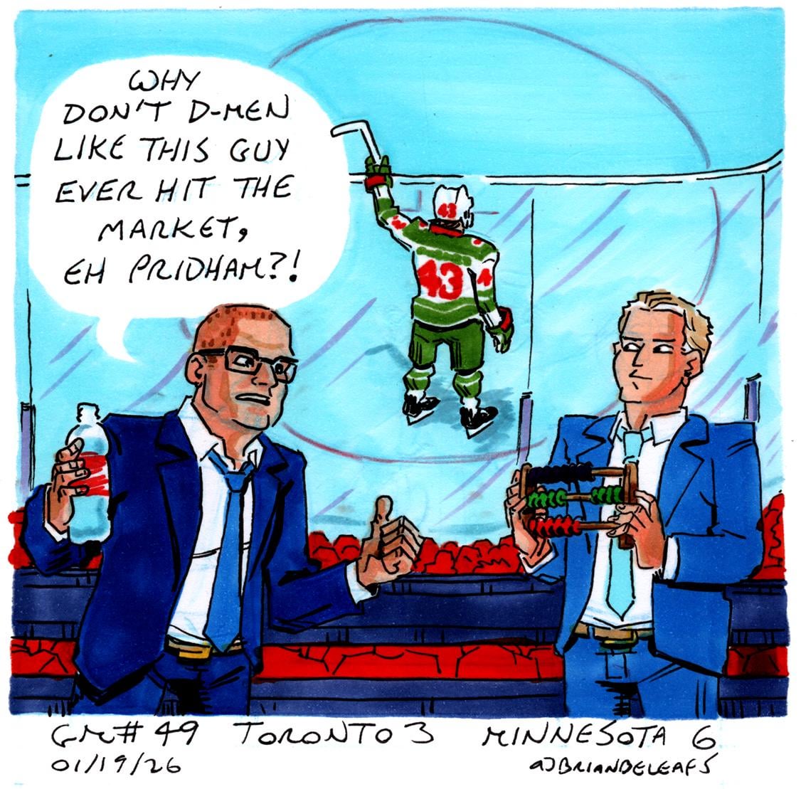 Game #49. Minnesota 6 Toronto 3 4 comments  We are so glad you’re back, Brian! I’m afraid we may have reached the end of the good times for the year. No Willy again and this team still can’t defend to save their soul. Welcome back! Leave a ReplyYou must be logged in to post a comment.