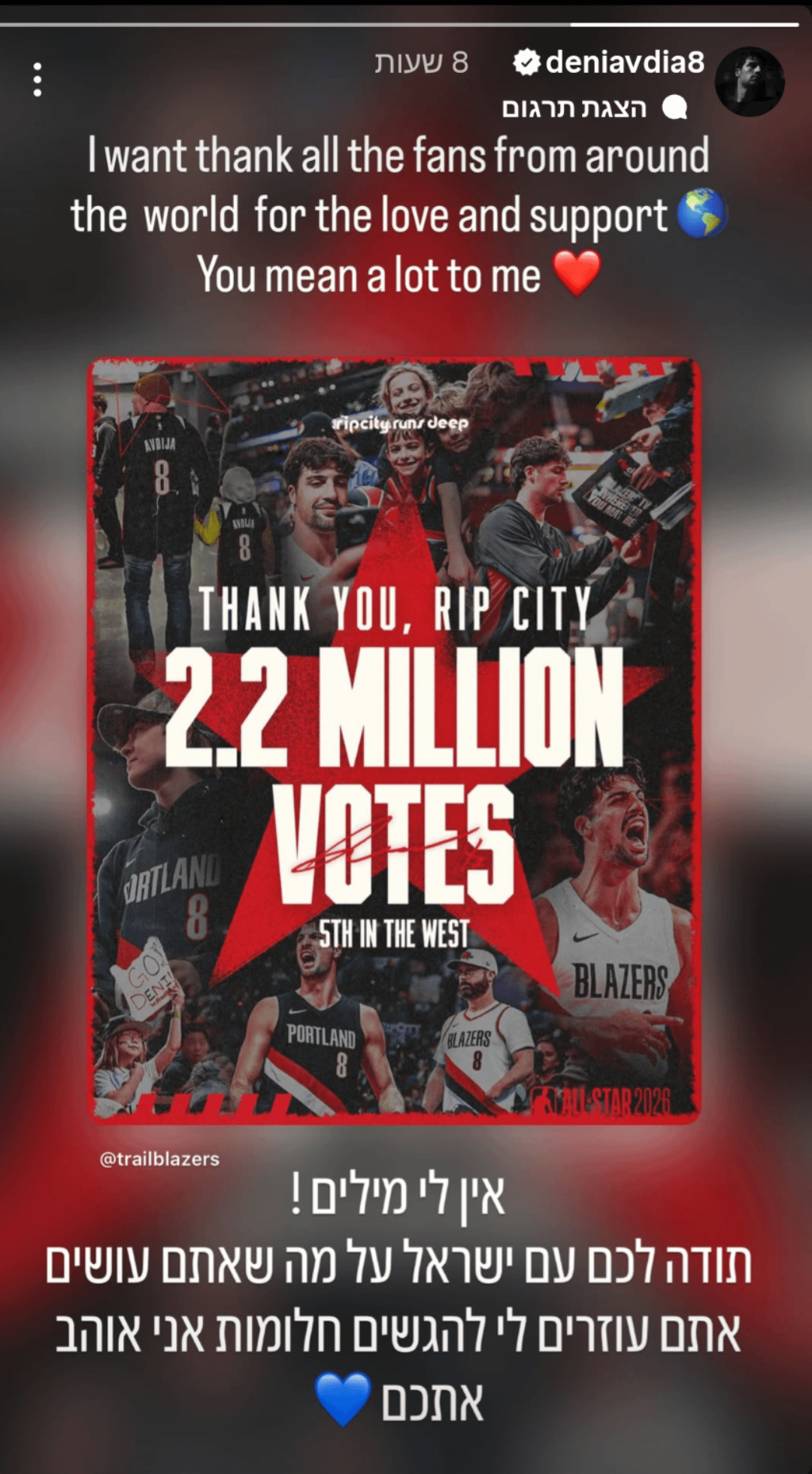 Deni shared the Blazers post on his IG story and added in Hebrew (paraphrasing a bit): "Thank you for everything you do. You're helping me make my dreams come true. I love you guys!"