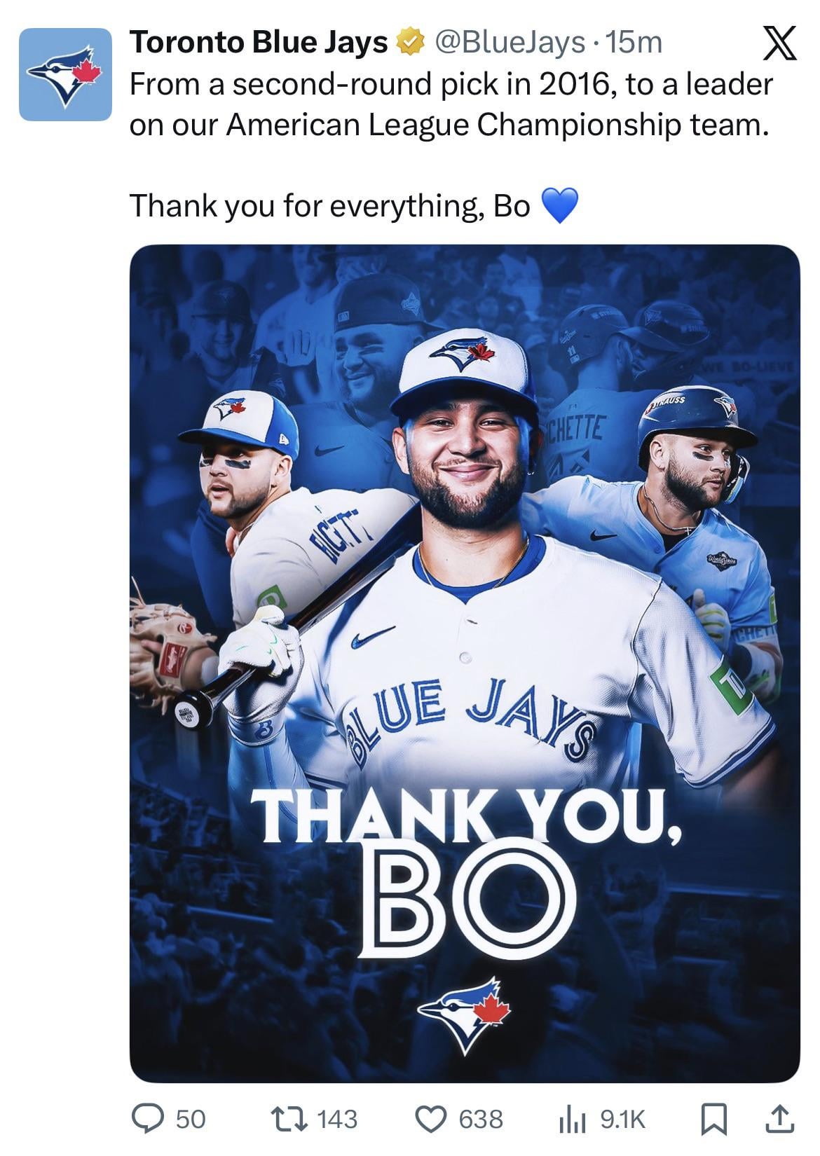 [Blue Jays] From a second-round pick in 2016, to a leader on our American League Championship team. Thank you for everything, Bo ๐