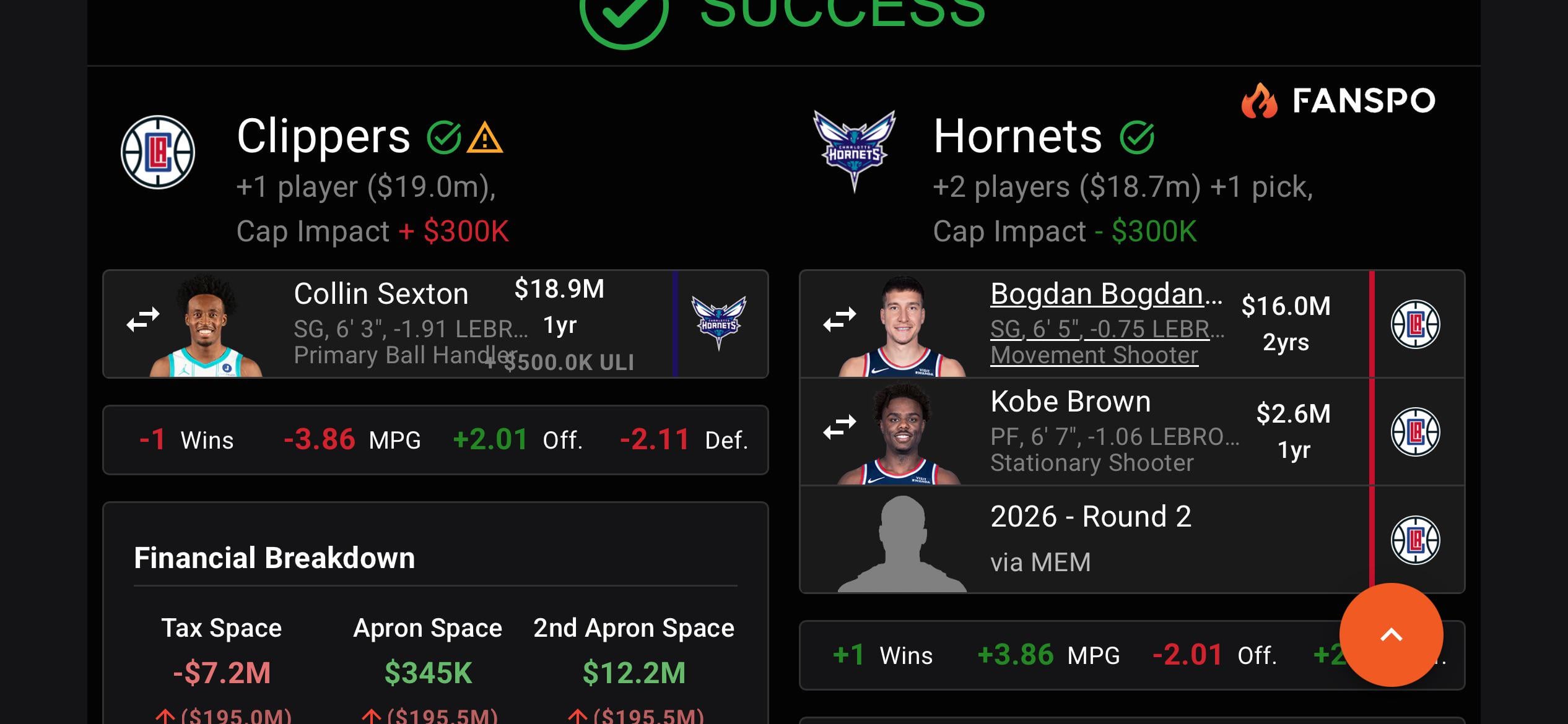Sexton would be a huge upgrade to our bench, doesn’t constrain our flexibility with a long term deal and neither Brown nor Bogi are players we’d especially miss. Bogi’s team option means that Charlotte are no worse off either and get a 2nd pick for their troubles. Brown is unlikely to break out like Diabate did, but there’s enough talent that he may find some degree of success in a new environment.