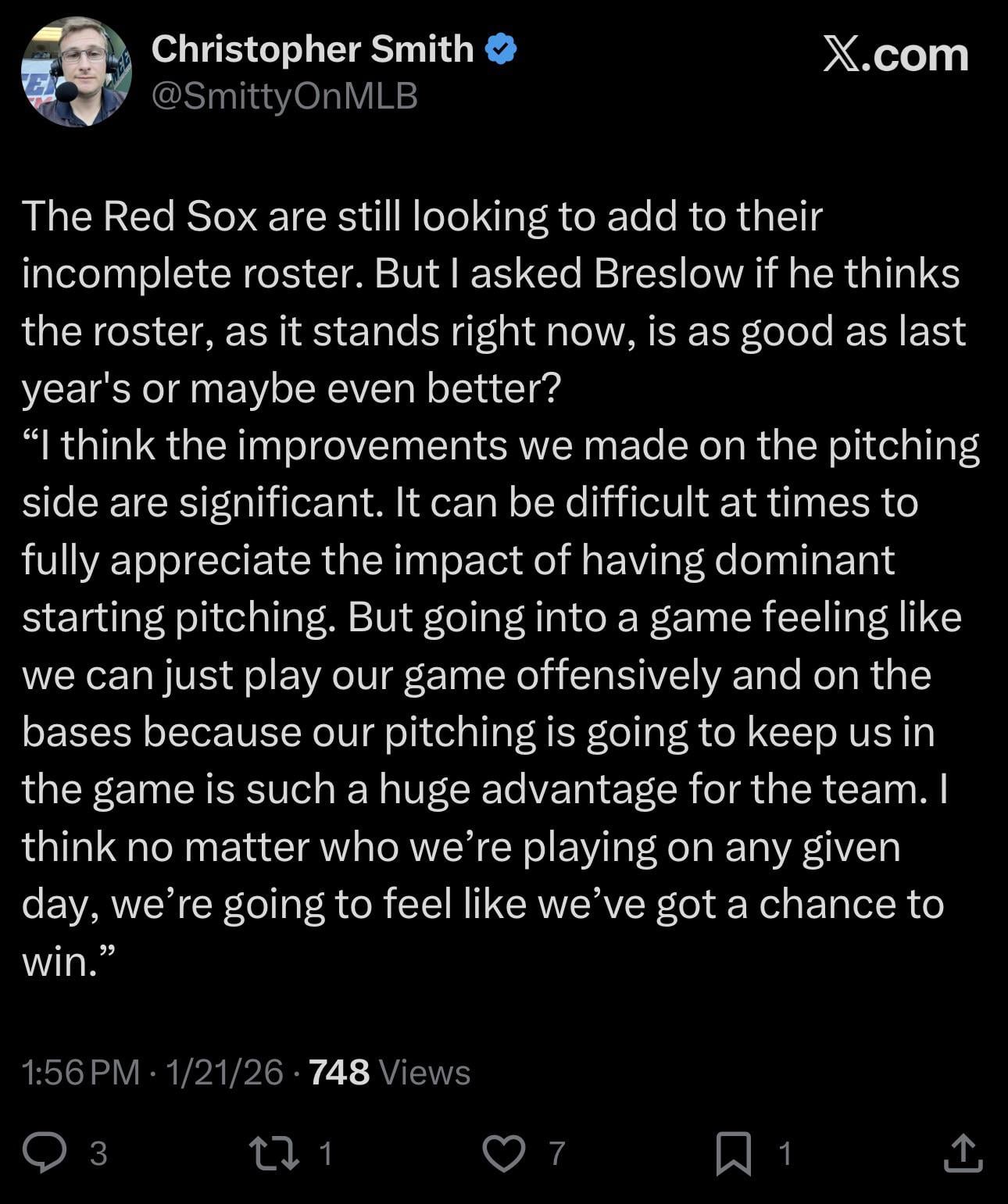 5. In all defense to Breslow, he has spoken in-depth, even today, on the fact Red Sox still have a lot to do. Defensive in fielding, acquiring a RH bat, etc. I appreciate this question from the interviewer, but let it be known it can be misleading if We conflate “Do you feel you’re better“ with “Do you feel you have a complete roster?”