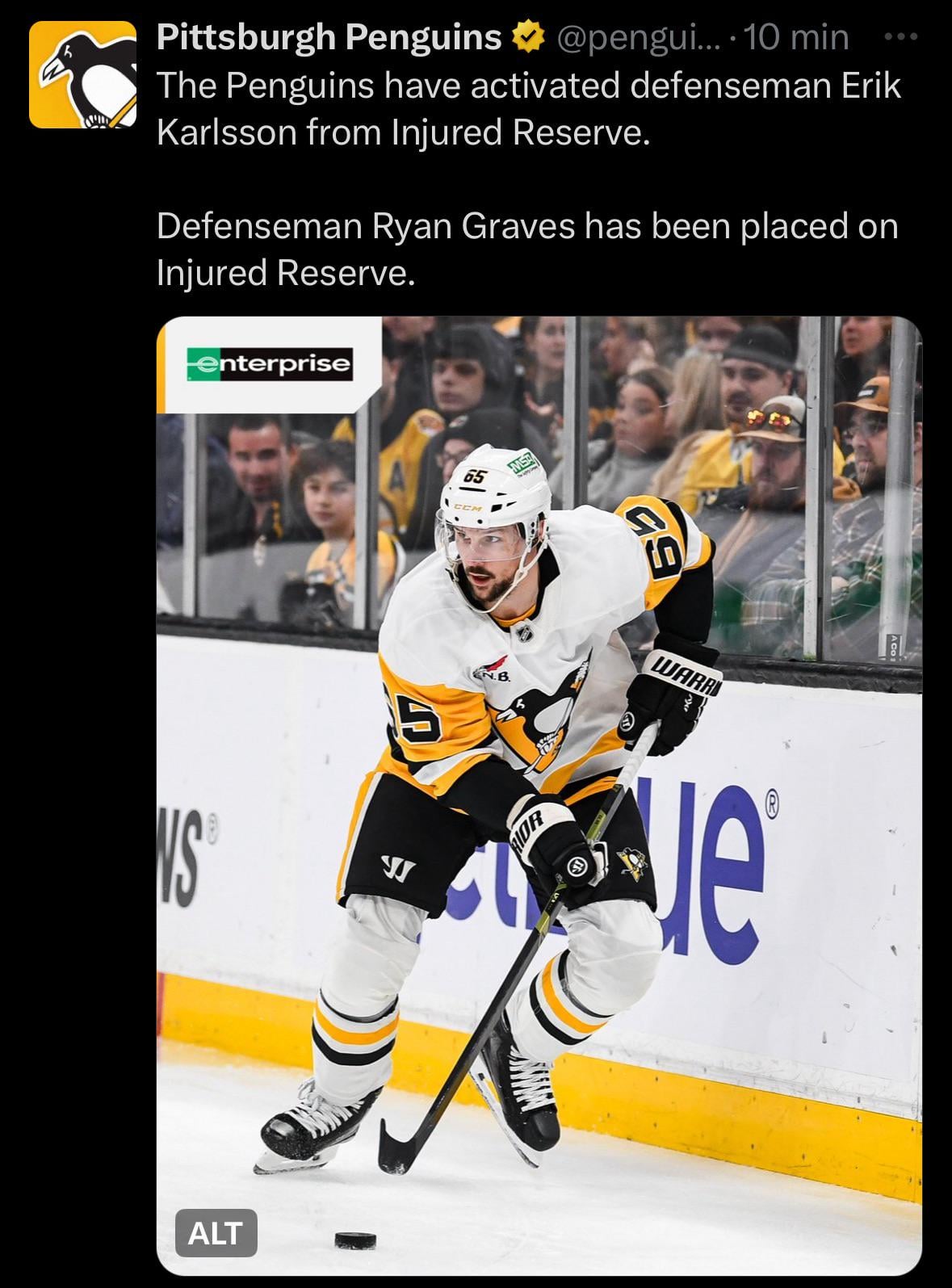 [Penguins] The Penguins have activated defenseman Erik Karlsson from Injured Reserve. Defenseman Ryan Graves has been placed on Injured Reserve. 12 comments Gravy my boy, you lasted one game. Glad to hear EK65 is back though! Ryan Graves going on IR isn’t a loss Revolving door of injuries lol. Hope Graves is available soon, he played well. Welcome back EK!  We are so fucking back Definition of upgrade What happened with Graves? Having to put Graves in for Karlsson is like having the Spread Gun in Contra and accidentally getting the Fireball gun. I’m so glad he’s back.  injured defenseman musical chairs That sucks for Graves. Hope he gets back soon. Glad EK is back though! That’s Erik “I’m not here to be a ‘mascot’ Karlsson. (*) (*) His words We’re going to need EK to counter Bouchard’s offense first defensive style. I want to see 40 two line passes tonight. Leave a ReplyYou must be logged in to post a comment.