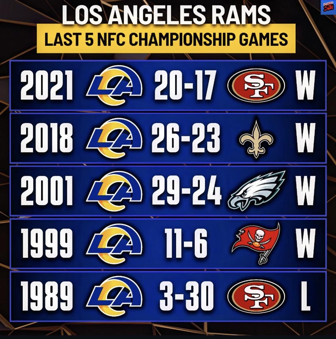The Rams Have Not Lost A NFC Championship Since 89’ 6 comments 😳😳😳  11-6 is crazy lol Holy jinx Thanks for the jinx! Delete this Leave a ReplyYou must be logged in to post a comment.
