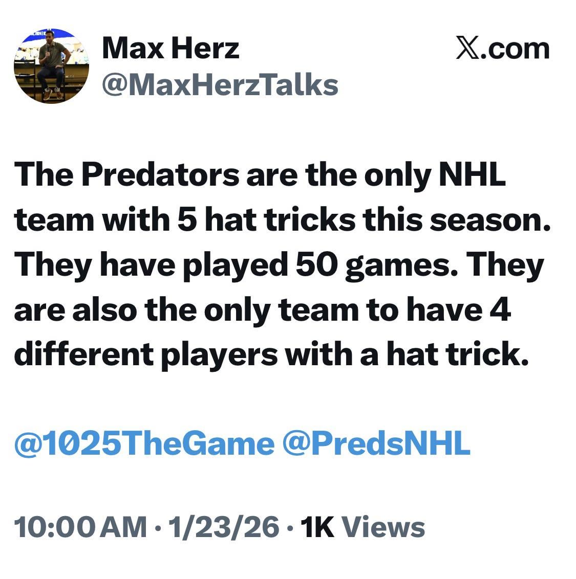 [Herz] The Predators are the only NHL team with 5 hat tricks this season. They have played 50 games. They are also the only team to have 4 different players with a hat trick.