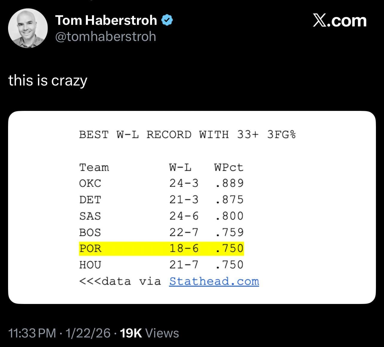 I love seeing us right there with Houston, someone went off on me before the season when I said Portland wouldn’t be far behind Houston (talking 7-8 games in the loss column.) interesting to see us shooting well when we all say we need to add shooting around Deni