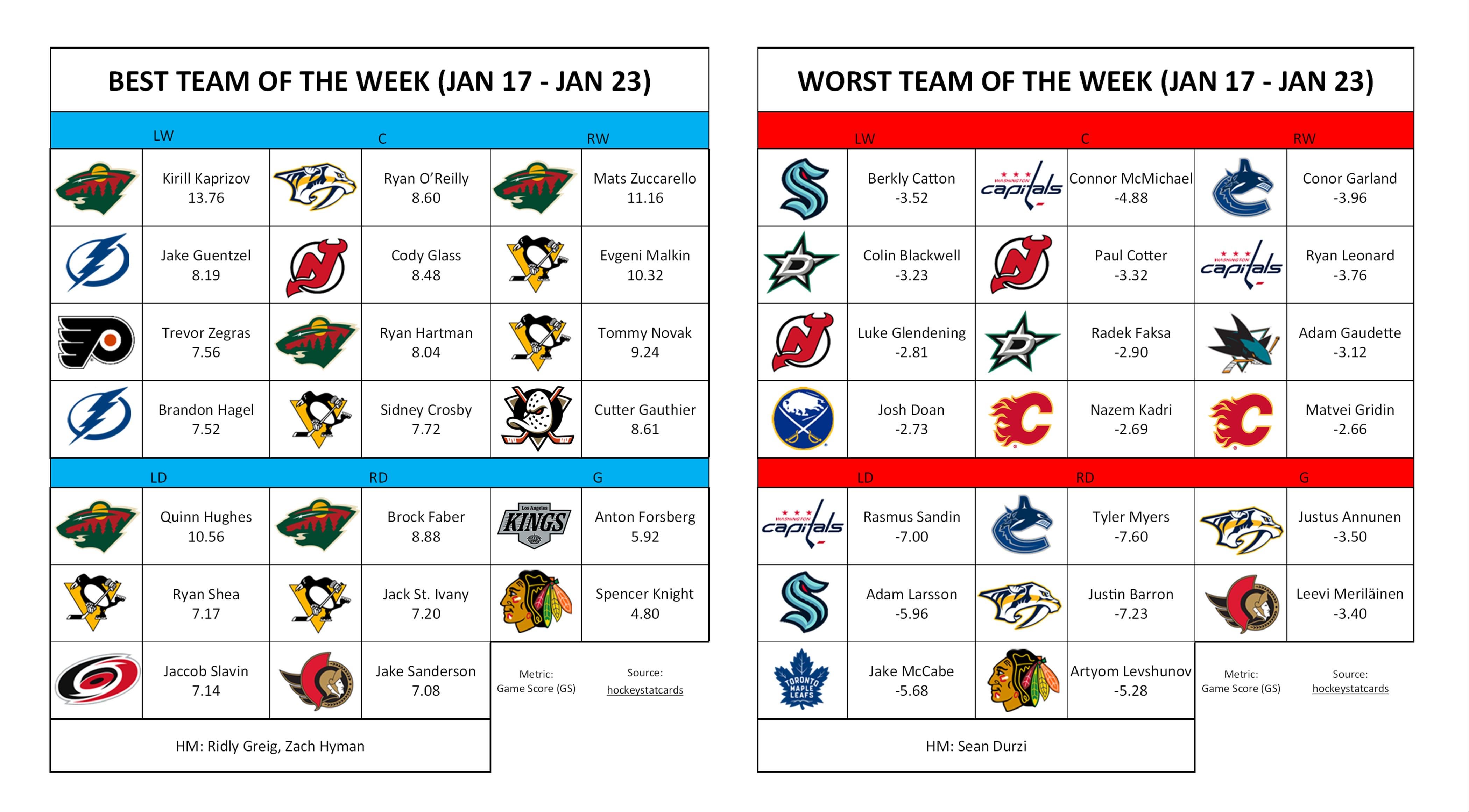 Best/Worst Team of the Week (Jan 17 – Jan 23) 3 comments glendening made this list playing in ONE game. Cots have a season to forget. Any decent 4C we can trade for? Would also be cool to get Halo in there for Palat. Leave a ReplyYou must be logged in to post a comment.