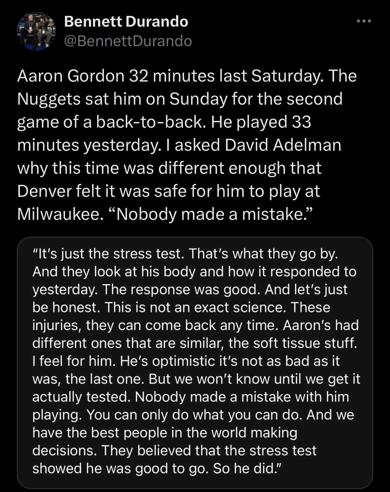 These guys are competitors who want to play. Injuries happen. Even Jokic’s injury was a random chance. All we can do is hope he recovers quickly and keep pressing on. I’m not prepared to throw the coaching staff under the bus just because they wanted to win a game and AG appeared good to go.