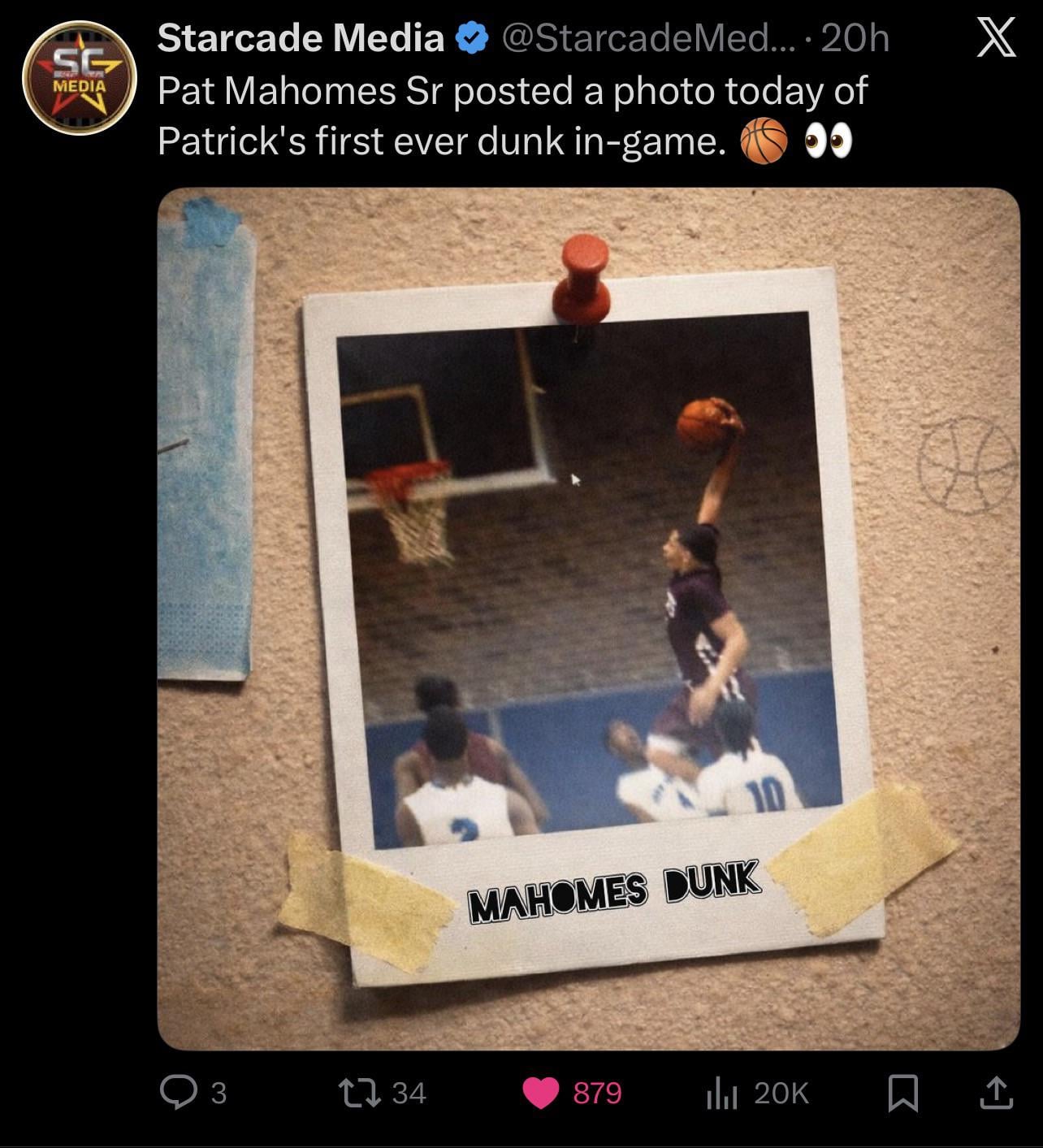 [Starcade Media] Pat Mahomes Sr. posted a photo today of Patrick’s first ever dunk in-game. 3 comments He doesn’t even look close lol The name of Number #4 in White? Josh Allen First layup right? Cause no way he’s close Leave a ReplyYou must be logged in to post a comment.
