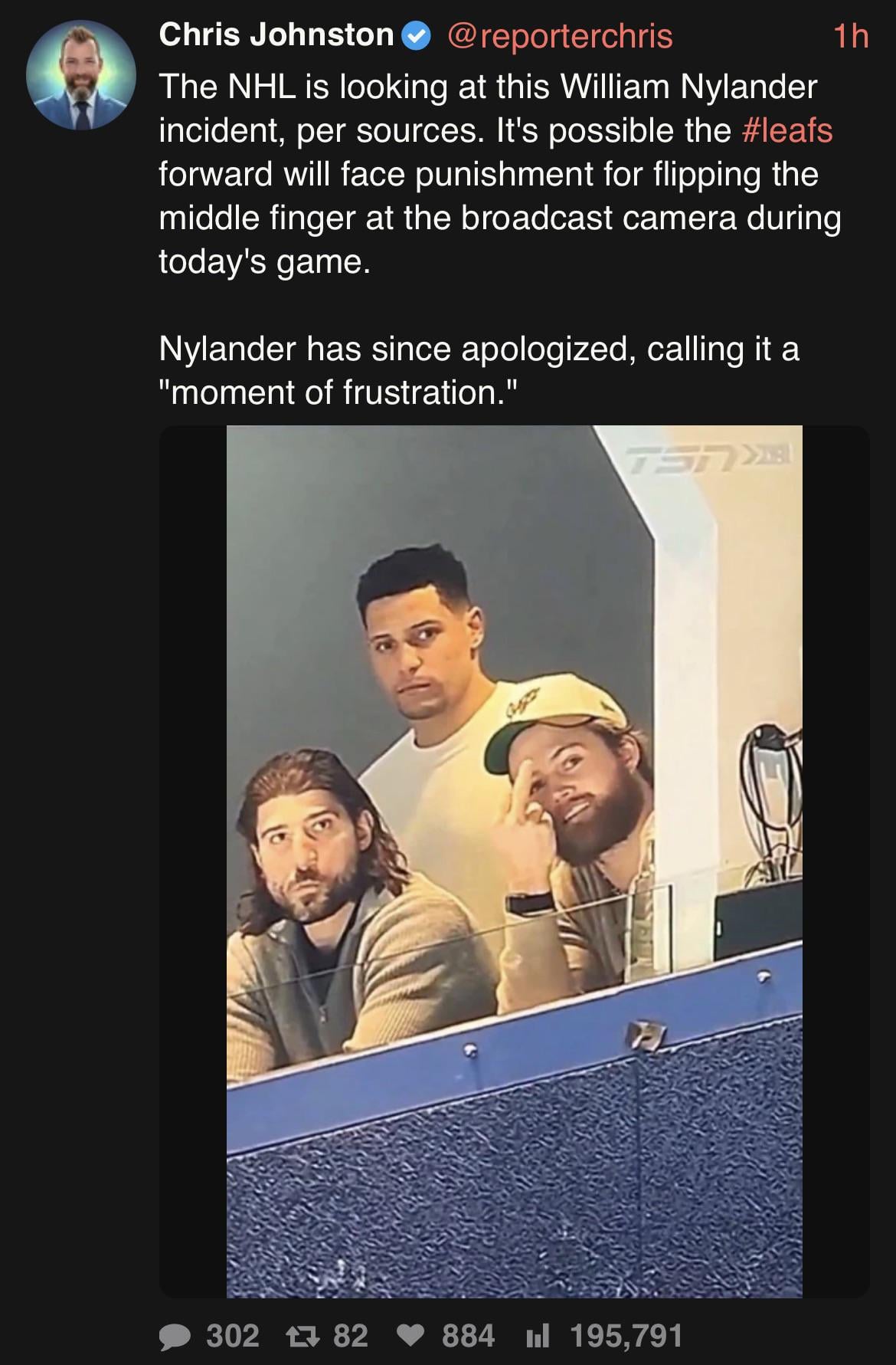 [Johnston] The NHL is looking at this William Nylander incident, per sources. It’s possible the leafs forward will face punishment for flipping the middle finger at the broadcast camera during today’s game. Nylander has since apologized, calling it “moment of frustration.”