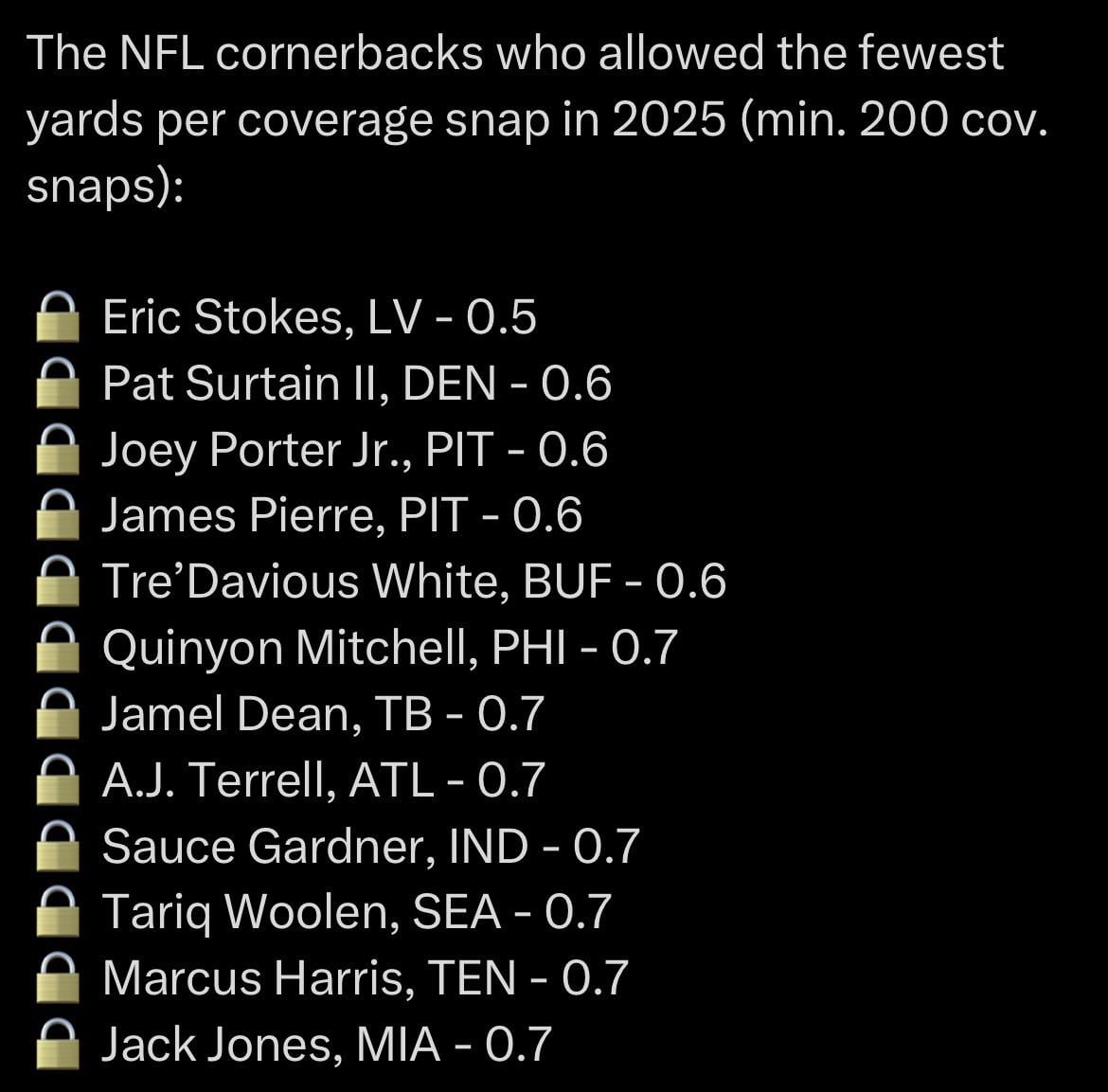 Other than Surtain and Woolen, the rest are sitting at home today. What does that tell you about how this stat correlates to winning?