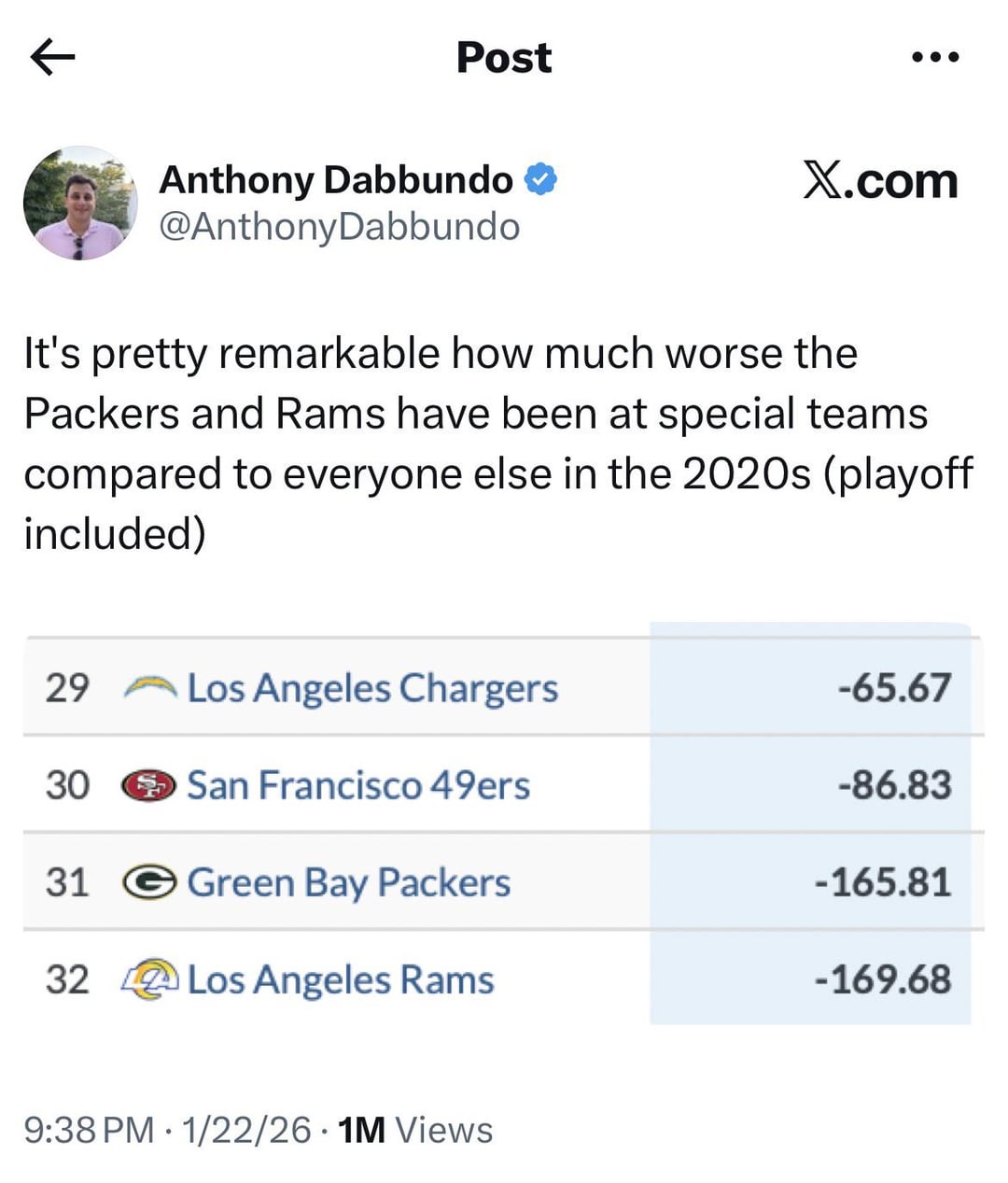 Us and the Rams have both lost multiple playoff games in large part to Special Teams blunders during this stretch. Maybe it’s time we give a shit.