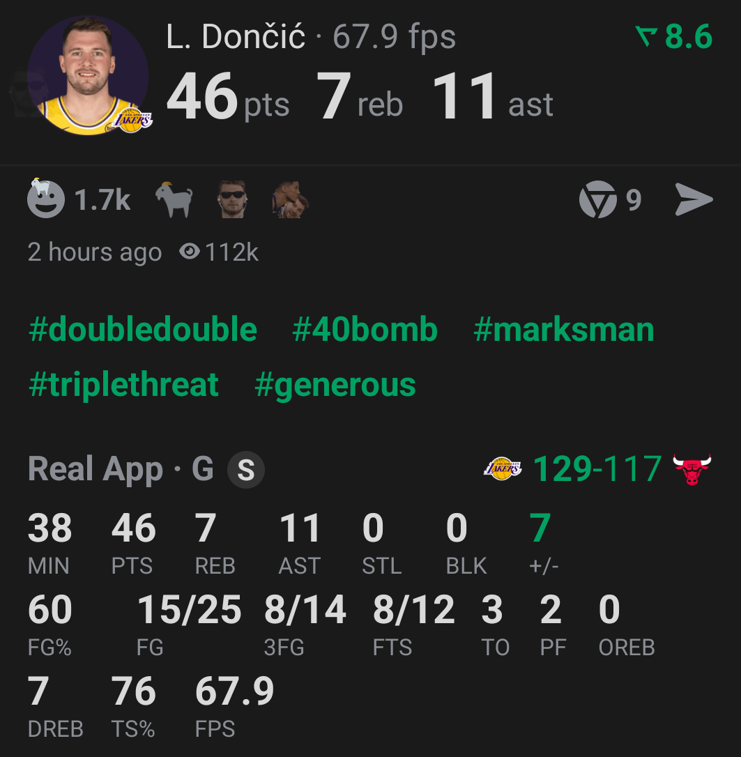 Love Luka – so much so I joined the lakers as a permanent fan. He slayed tonight and has been on a strong upward trend over the last 5 or so games, and even more so with his defense. Luka can put up numbers and that is what makes him Luka, but I think we should be cheering his defense more.