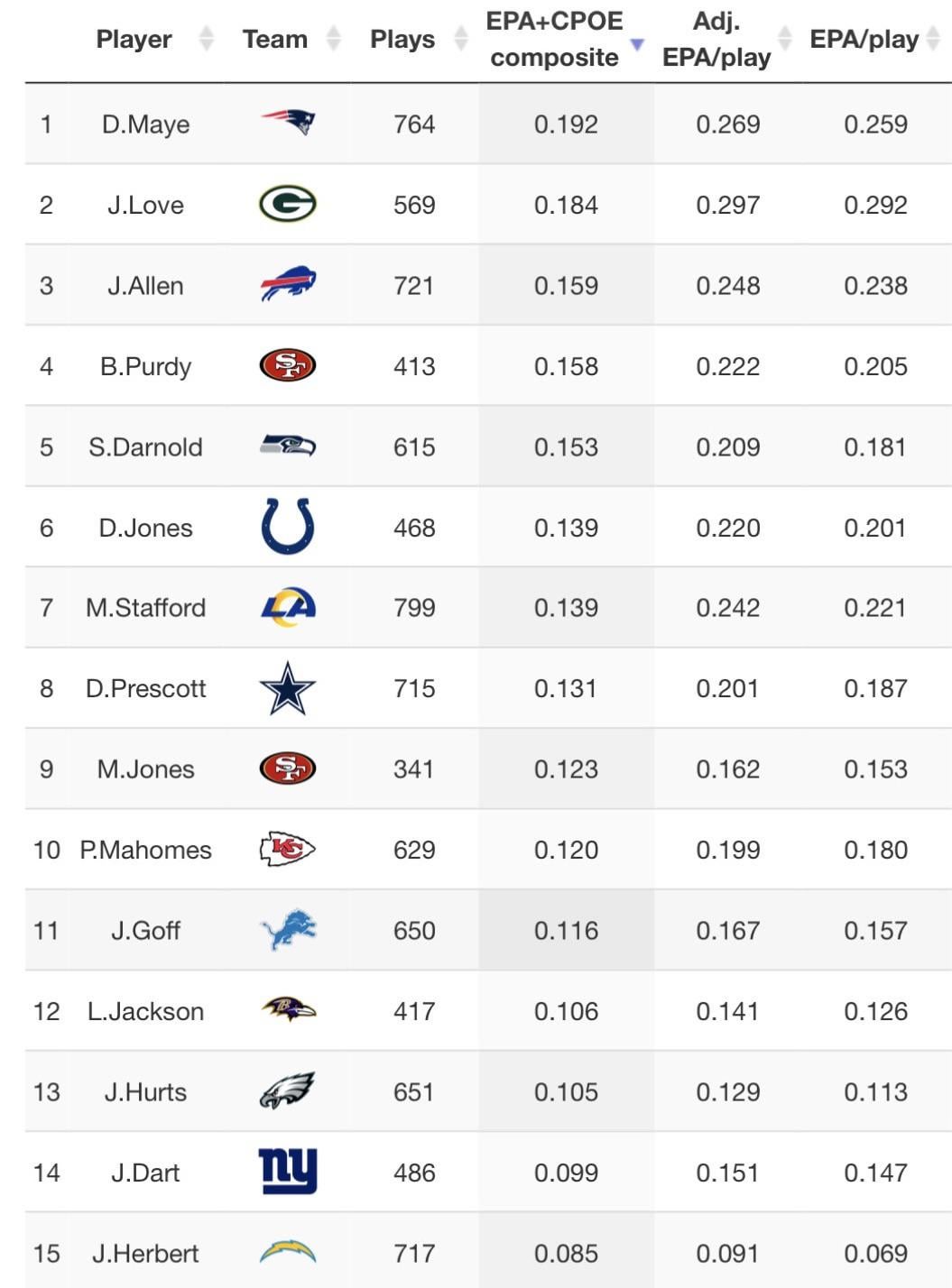 I always want to learn a little more about outliers in stats like these because Love, if you just look at traditional stats and actual results would not be painted as a clear tier 1 QB with Maye and more of a fringe top 10.