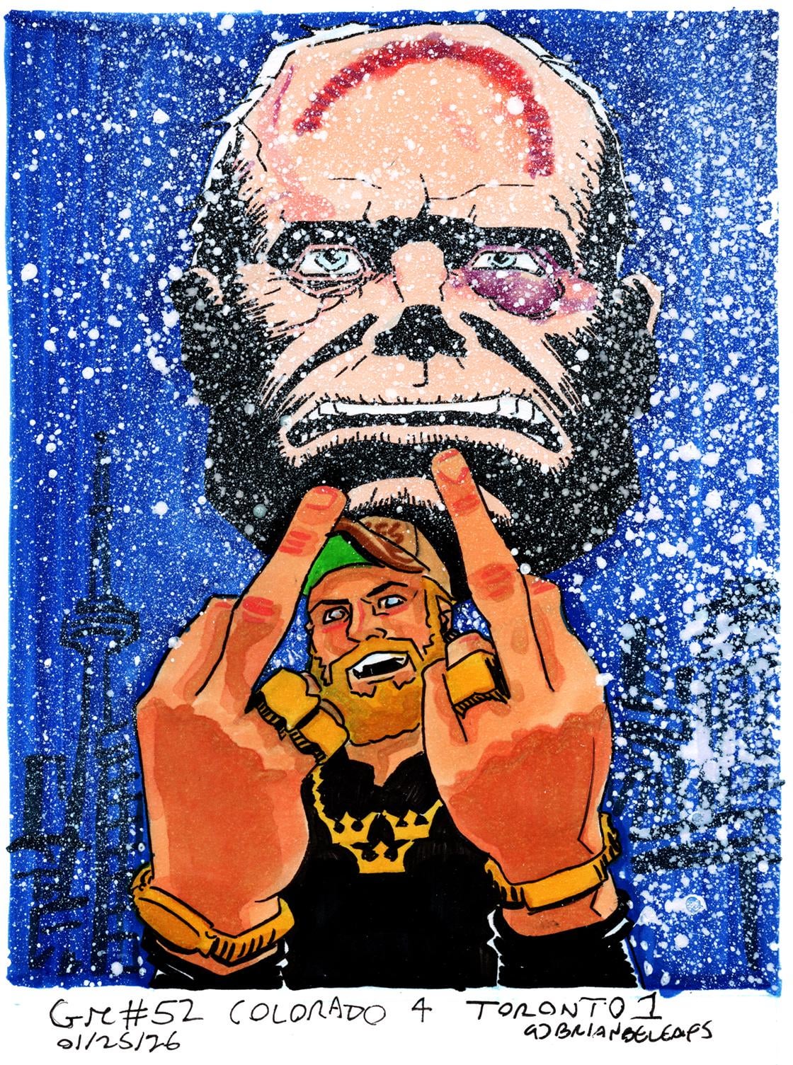 Game #52 Colorado 4 V Toronto 1 13 comments I’d wear this on a t shirt Lmaooo. Perfection. Excellent work, per usual. That is a disturbingly good drawing of Berube Lmao Top tier!  I like depicting Berube like a character from Frank Miller’s Sin City Beautiful work, Brian Amazing Dang rough stuff for MLSE. Hope this is a reality check for this lazy organization and their pampered players. Holy fuck bud Heck yeah Leave a ReplyYou must be logged in to post a comment.