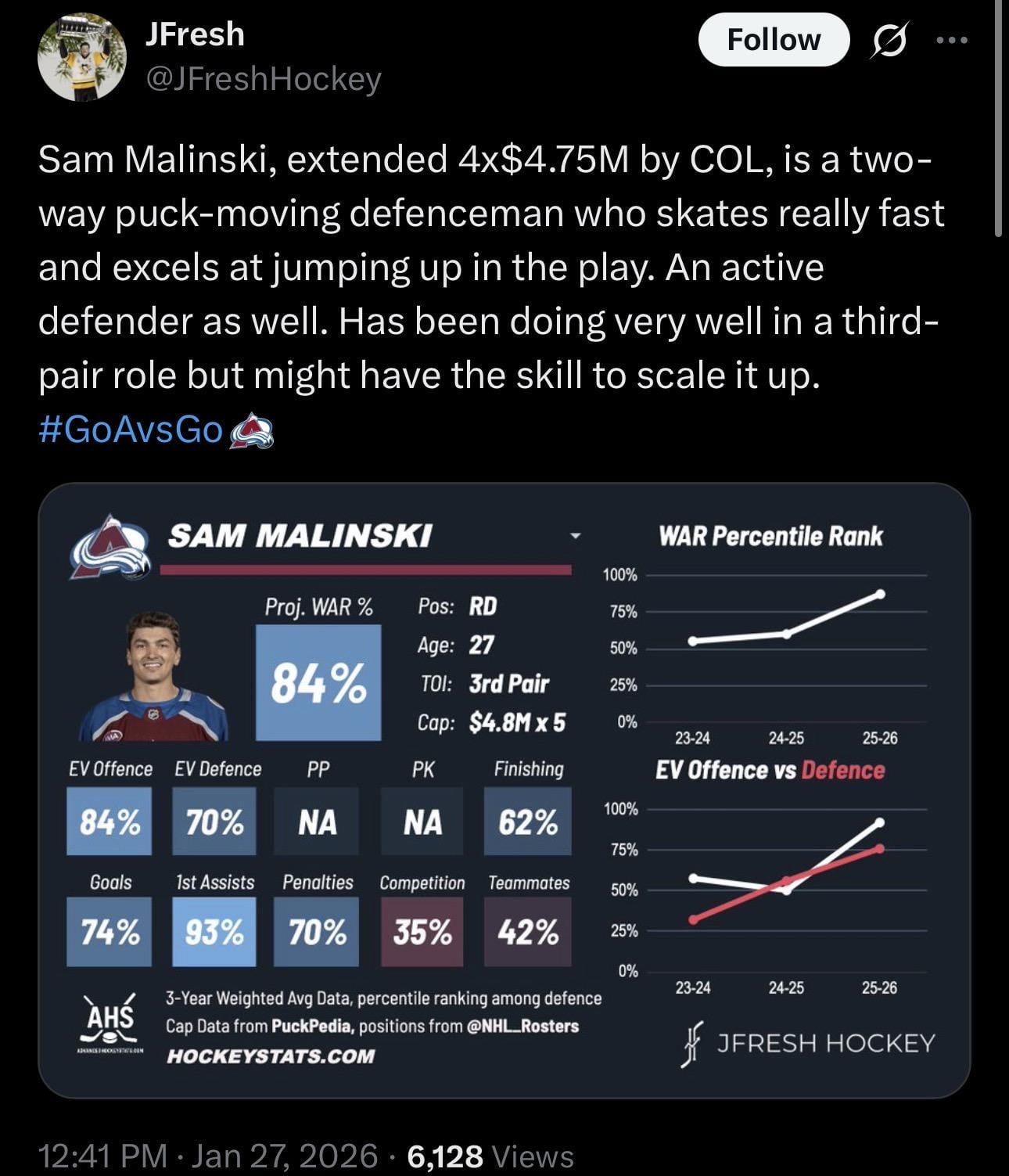 [Jfresh] Sam Malinski, extended 4x$4.75M by COL, is a two-way puck-moving defenceman who skates really fast and excels at jumping up in the play. An active defender as well. Has been doing very well in a third-pair role but might have the skill to scale it up.