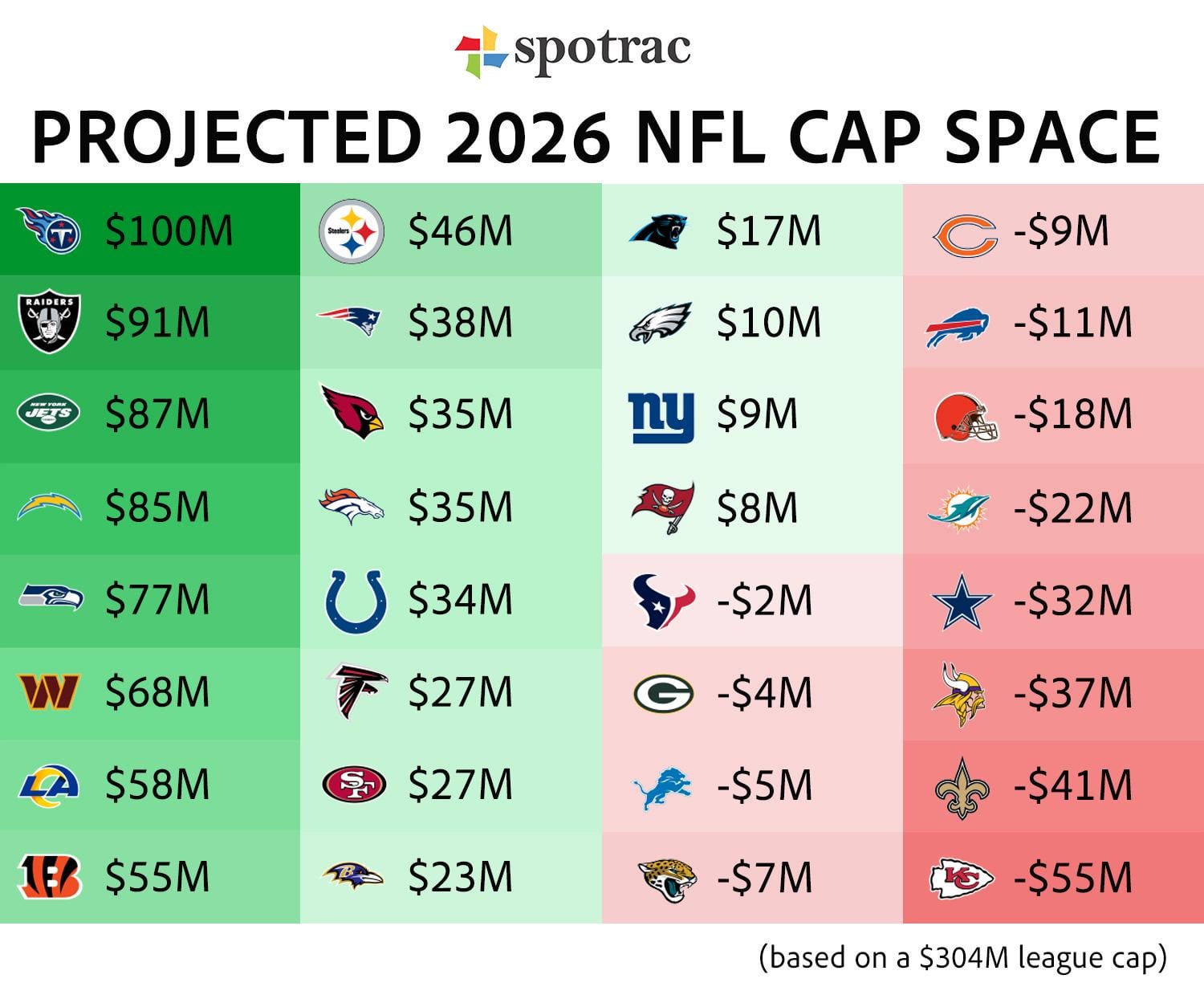 These are our current top cap hits for 2026. Several of these can be restructured to clear up more space and likely will. The $8M figure noted is a point in time reference. Nothing really matters until the new league year starts in mid March.