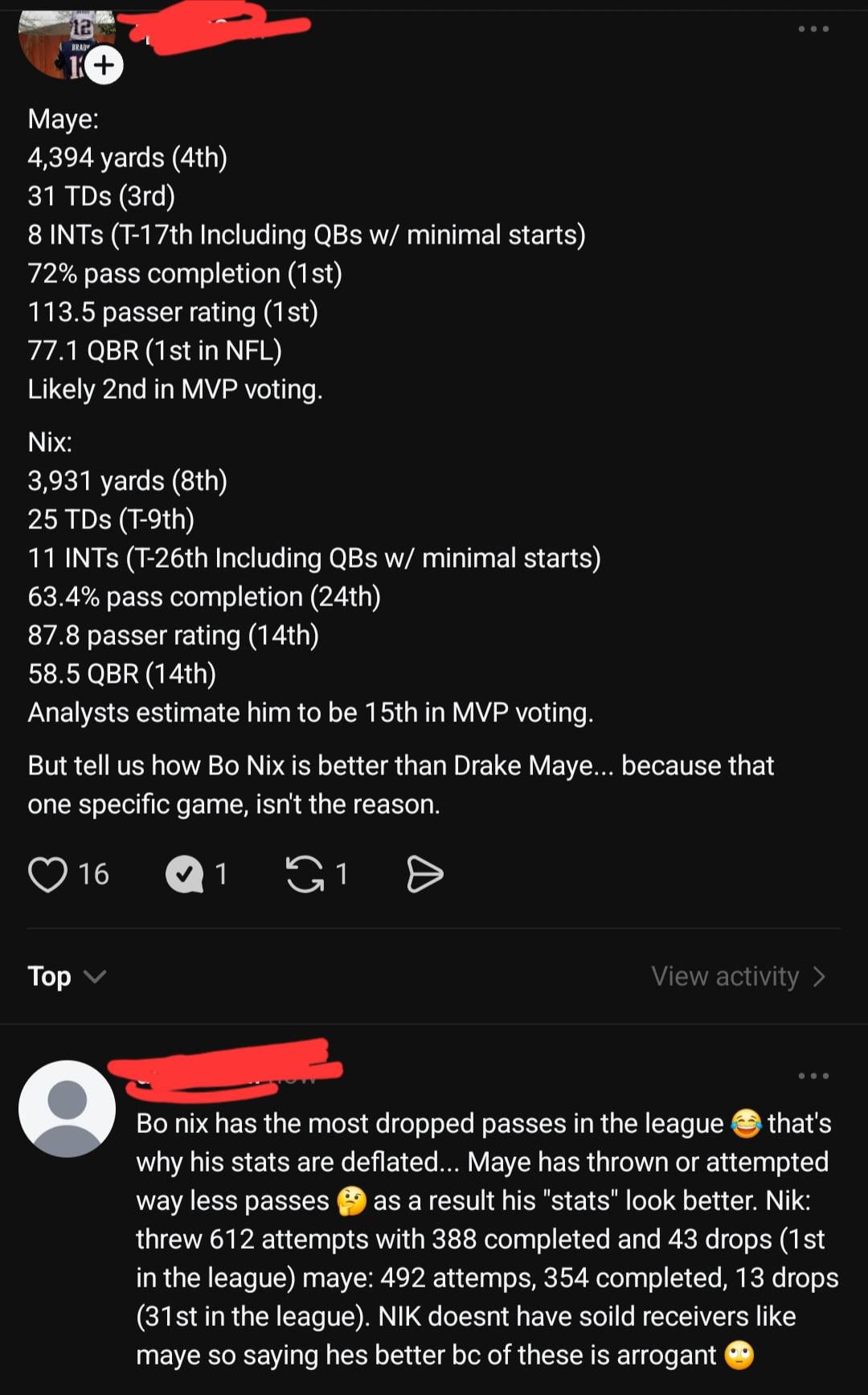 It’s pretty hard (and unnecessary) to argue that Nix was better than Maye this year. He’s elite in avoiding sacks and end of half/game situational football, but he’s got a lot of room for improvement beyond that. That said, his receiving corps is mediocre, run game is lacklustre, and he’s just entering his 3rd year so there’s no reason to think he can’t get better.