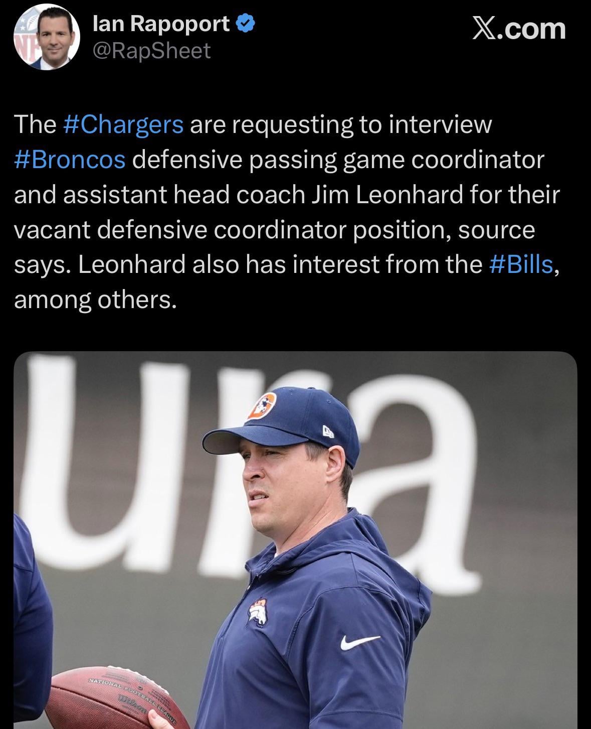 [Rapoport] The #Chargers are requesting to interview #Broncos defensive passing game coordinator and assistant head coach Jim Leonhard for their vacant defensive coordinator position, source says. Leonhard also has interest from the #Bills, among others.