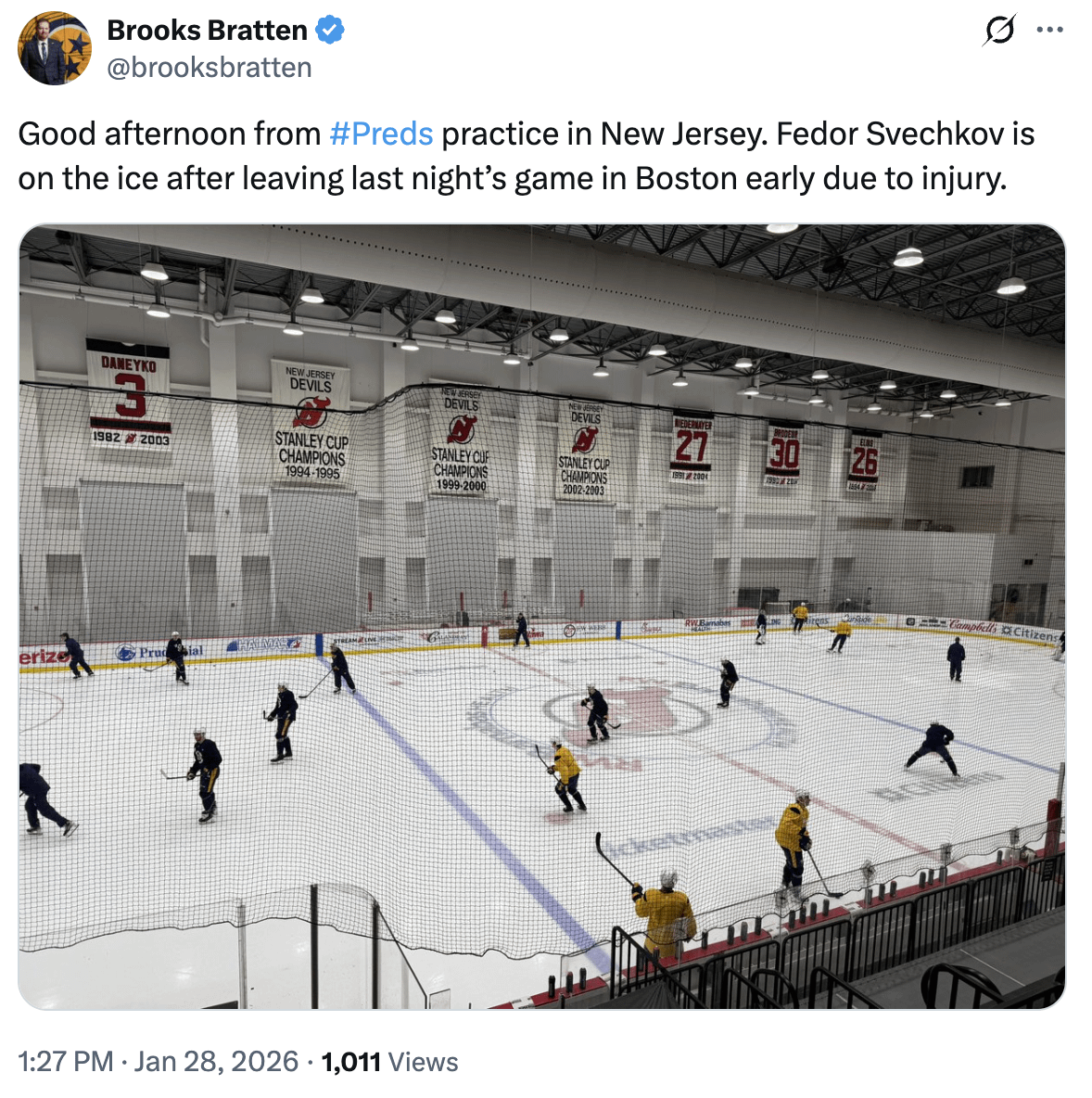 [Bratten] Good afternoon from Preds practice in New Jersey. Fedor Svechkov is on the ice after leaving last night’s game in Boston early due to injury.