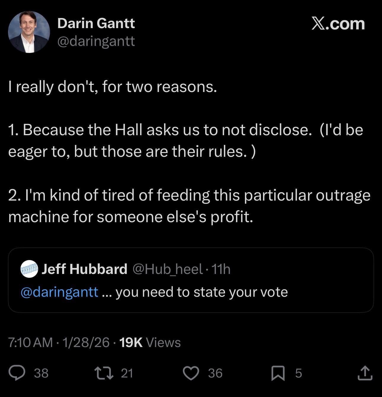 I don’t think this is the admission some people are making it out to be. If the Hall asks him not to disclose, then he shouldn’t be expected to do so. If I was in his exact position I would give a very similar answer no matter which way I voted.