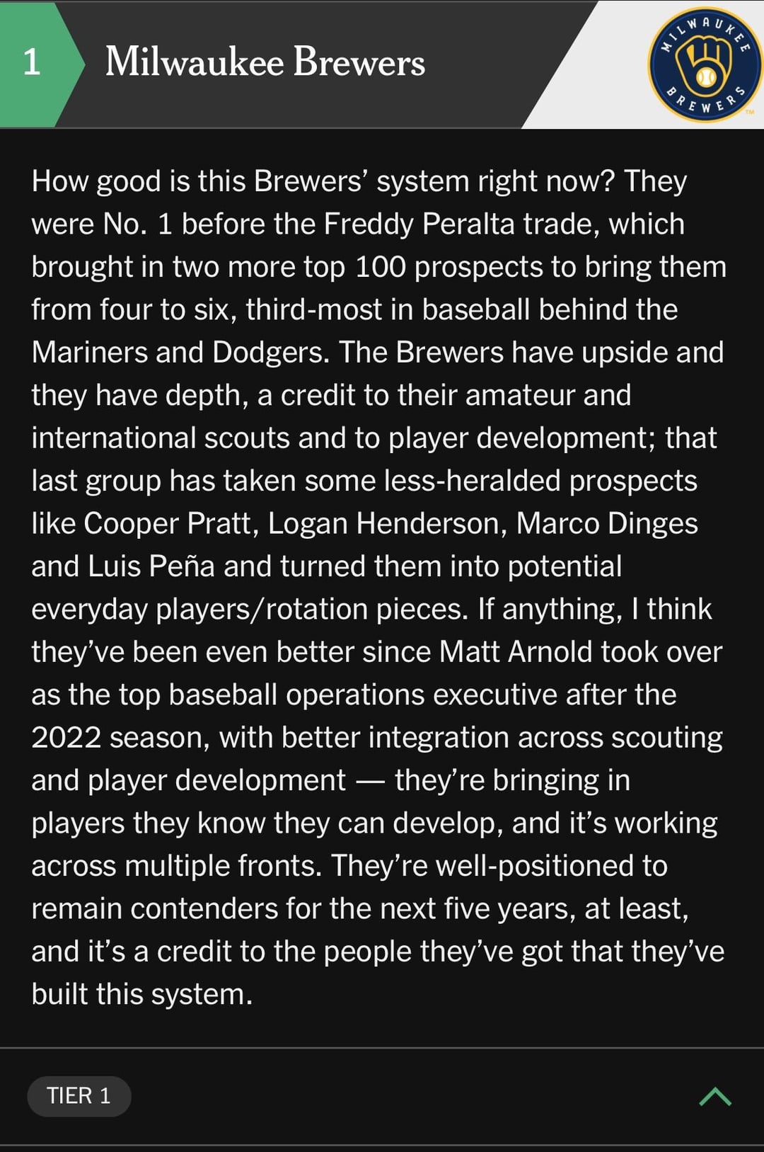 The Athletic (Keith Law) and ESPN (Kiley McDaniel) both have the Brewers ranked as their #1 farm system. We all know that there is a perceived disrespect from the media from many fans, and I’m not saying that isn’t true in some cases. However, when you look at the work of real sports journalists—and it feels like I’m underselling Law and McDaniel to call them just that—there is great respect for our organization and how we run things.