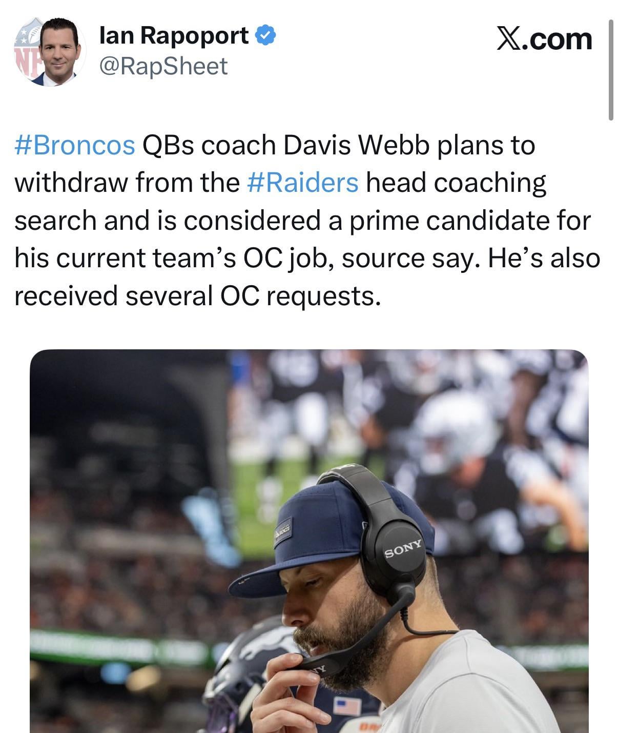 [Rapoport] #Broncos QBs coach Davis Webb plans to withdraw from the #Raiders head coaching search and is considered a prime candidate for his current team’s OC job, sources say. He’s also received several OC requests.