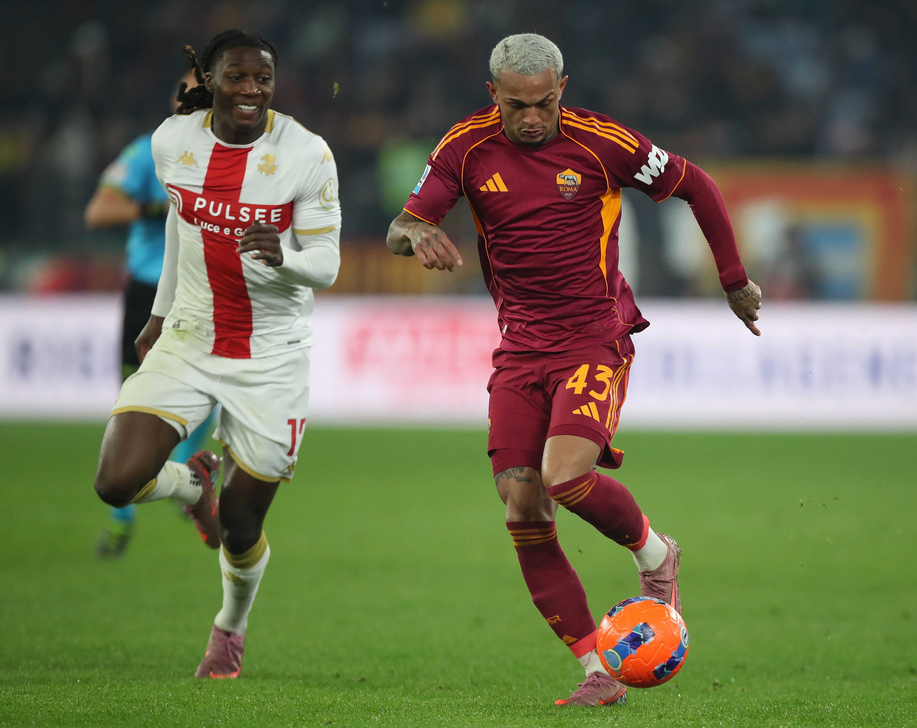 ROME, ITALY – DECEMBER 29: Franca Lima Wesley of AS Roma competes for the ball with Brooke Norton-Cuffy of Genoa CFC during the Serie A match between AS Roma and Genoa CFC at Stadio Olimpico on December 29, 2025 in Rome, Italy. (Photo by Paolo Bruno/Getty Images)