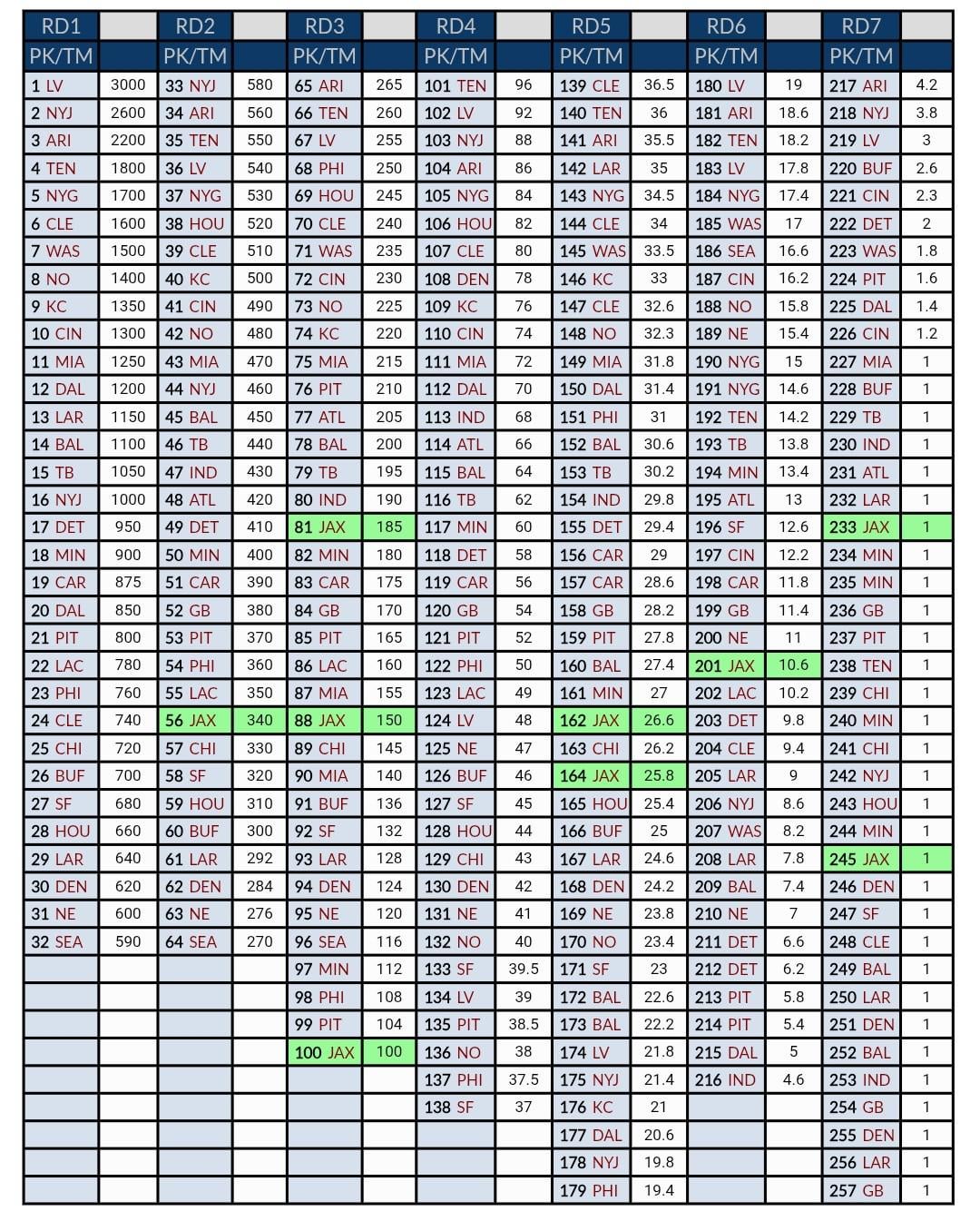 3026-2697 means the Jags trade deficit was 329 points. What this means is that to make the move we did, we gave up the draft equivalent of the 25th pick of the 2nd round.