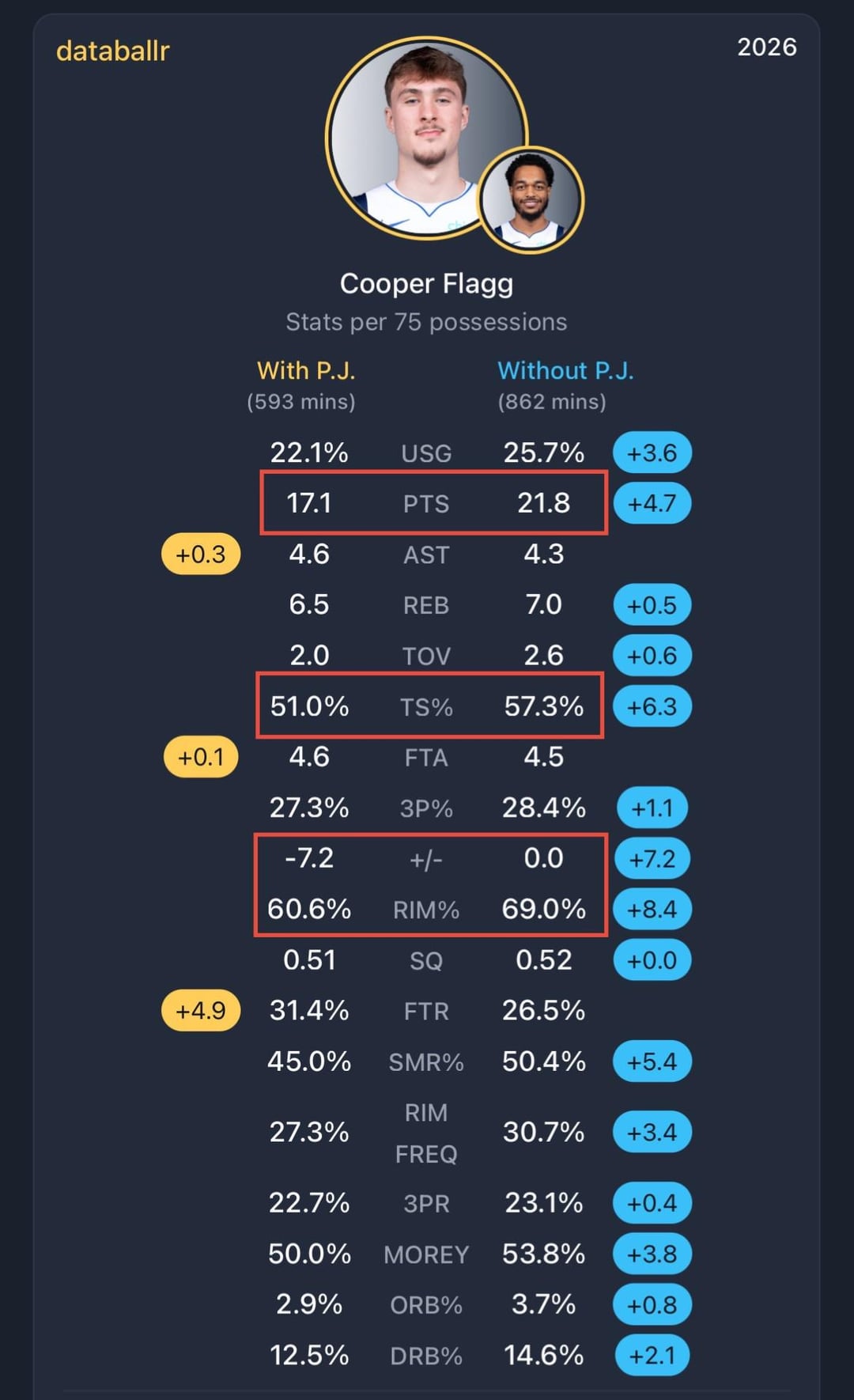 Idk if I’ve ever seen one player have such a vast negative impact on multiple players on a team as I have w/PJ & this roster. Just comically large jumps in efficiency & overall productivity for these players & ultimately team success (ie +/-) when he’s not on the court w/them vs. when he is. 😭