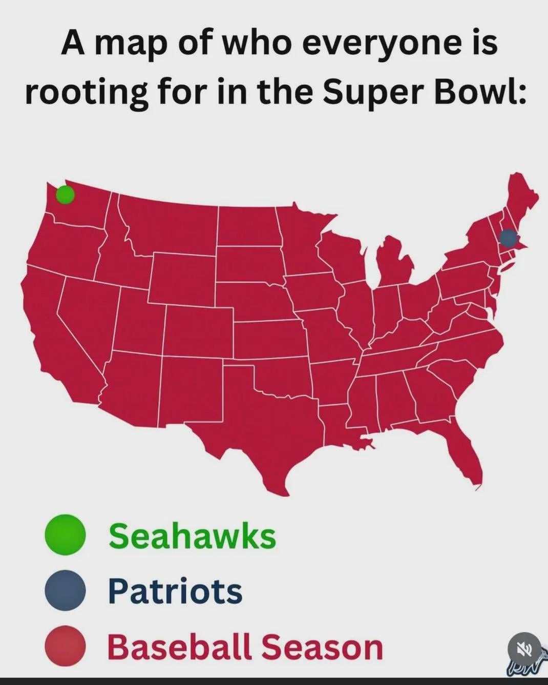 LFG 7 comments This somehow manged to exclude both Boston and Foxboro from the blue dot I like the Seahawks… The upper peninsula of Michigan is rooting for hockey I suppose? Florida! Marlins and Yankees! Honestly I’m rooting for Darnold. Hope he gets a ring. What’s wrong with either of those teams? Lol, nobody is thinking about baseball during football season. Leave a ReplyYou must be logged in to post a comment.