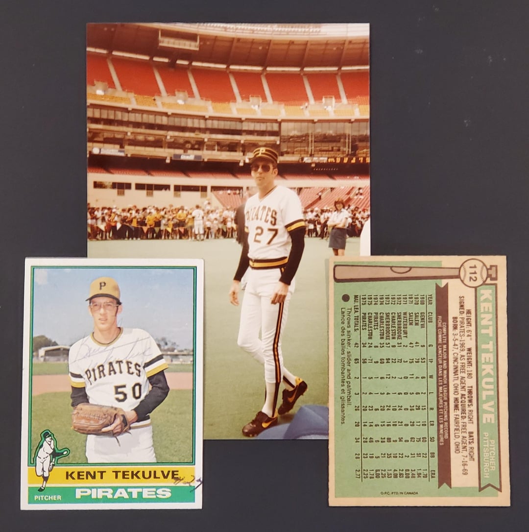 Teke was one of my favorite Pirates from the era. An excellent relief pitcher and (for one play) one hell of a left fielder. I wanted to show a few recent cards I picked up and a photo from 1985 that I recently found in a box at my parent's house. The Topps card has a period correct autograph and the second card is the O-Pee-Chee version of the same rookie card.