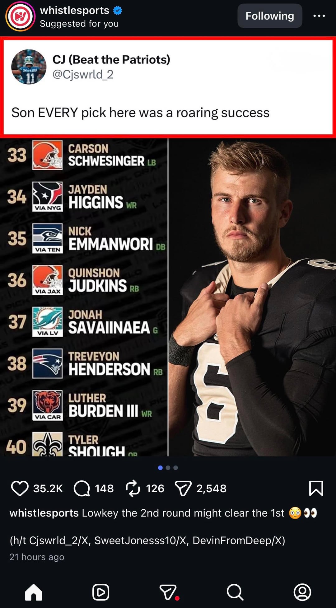 Wow, making me realize how we would have benefitted from Henderson, Judkins, or Saviianea. I hope Higgins pays off, but our offense needed the RB and OL we didn’t have