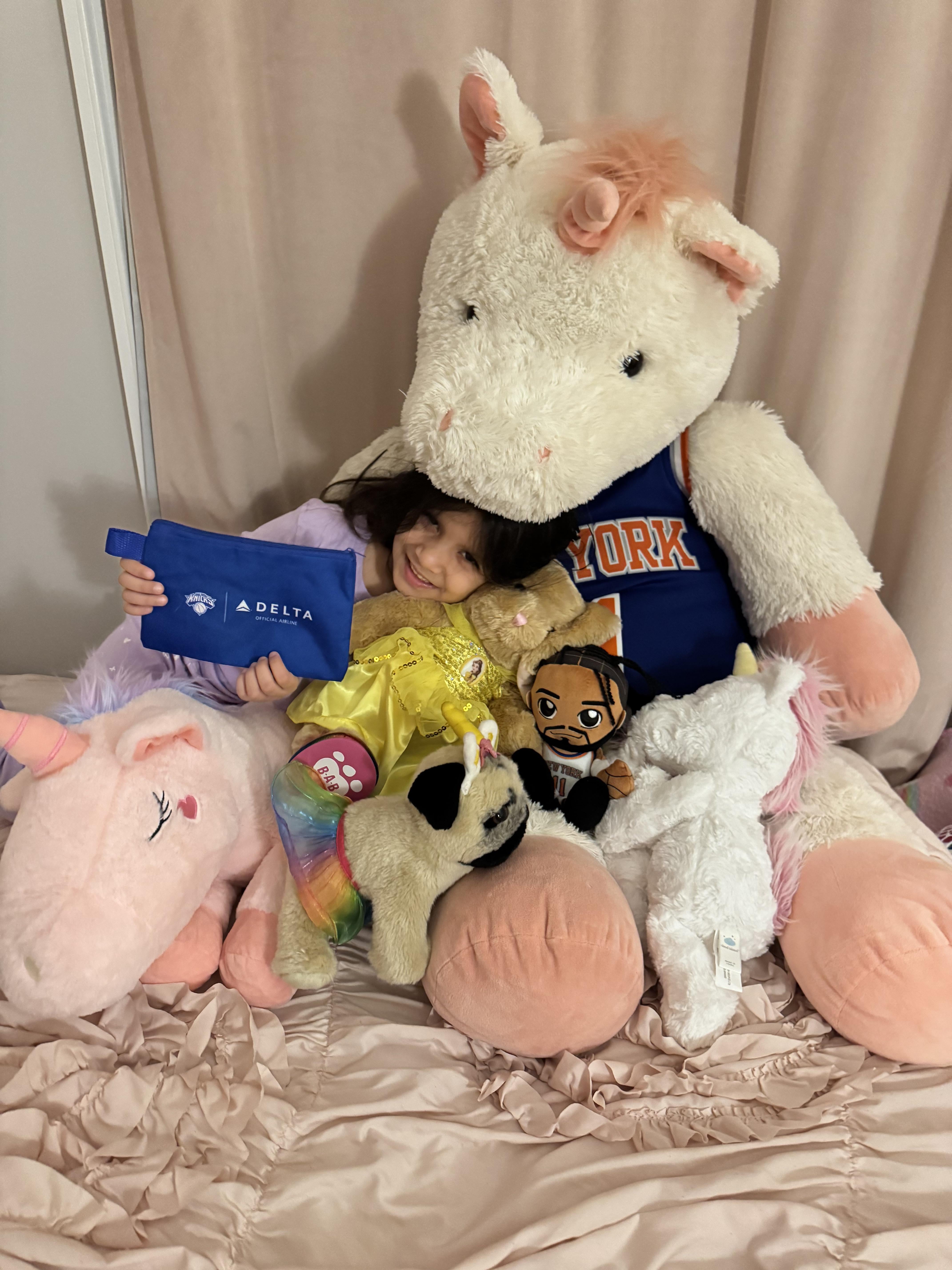 Big shout out to [u/](u/charl)[alphacharliekilo](u/charl) for sending over the pride night pouch. It’s now a key piece in my little girls collection. And yes that is a 4 foot unicorn “Corny” sporting an adult sized Brunson jersey as well. She has a standing spot in the living room for game day.
