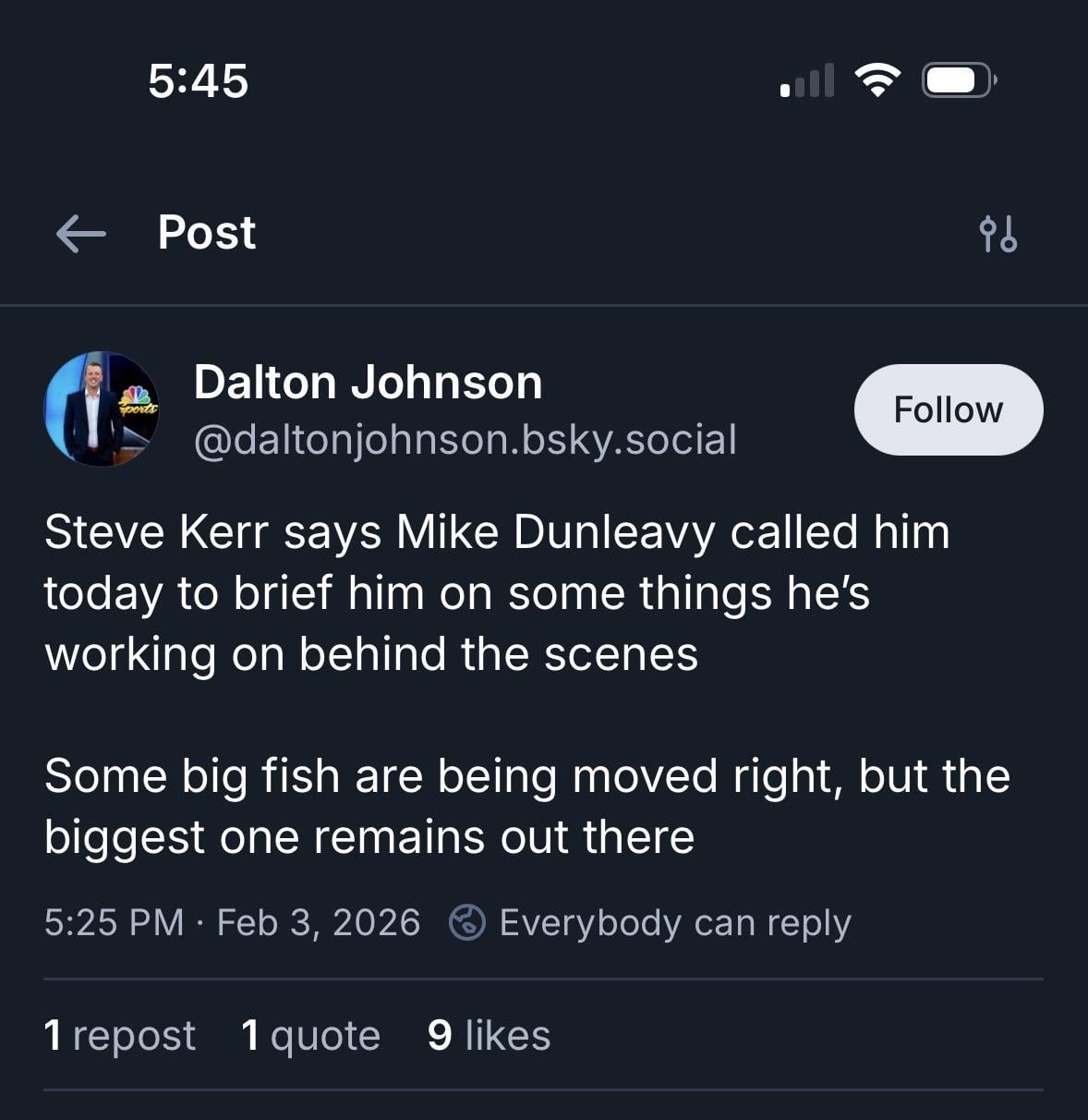 [Johnson] Steve Kerr says Mike Dunleavy called him today to brief him on some things he’s working on behind the scenes
