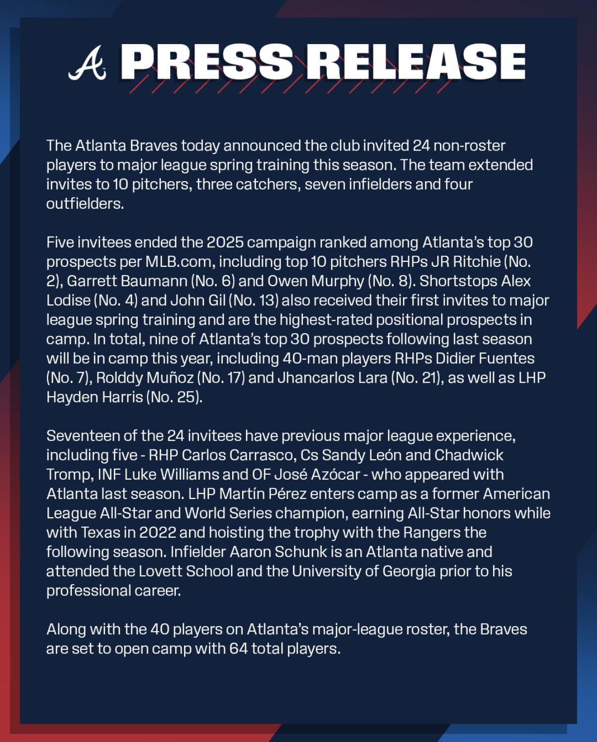 [Braves] The #Braves today announced the club invited 24 non-roster players to major league spring training this season: