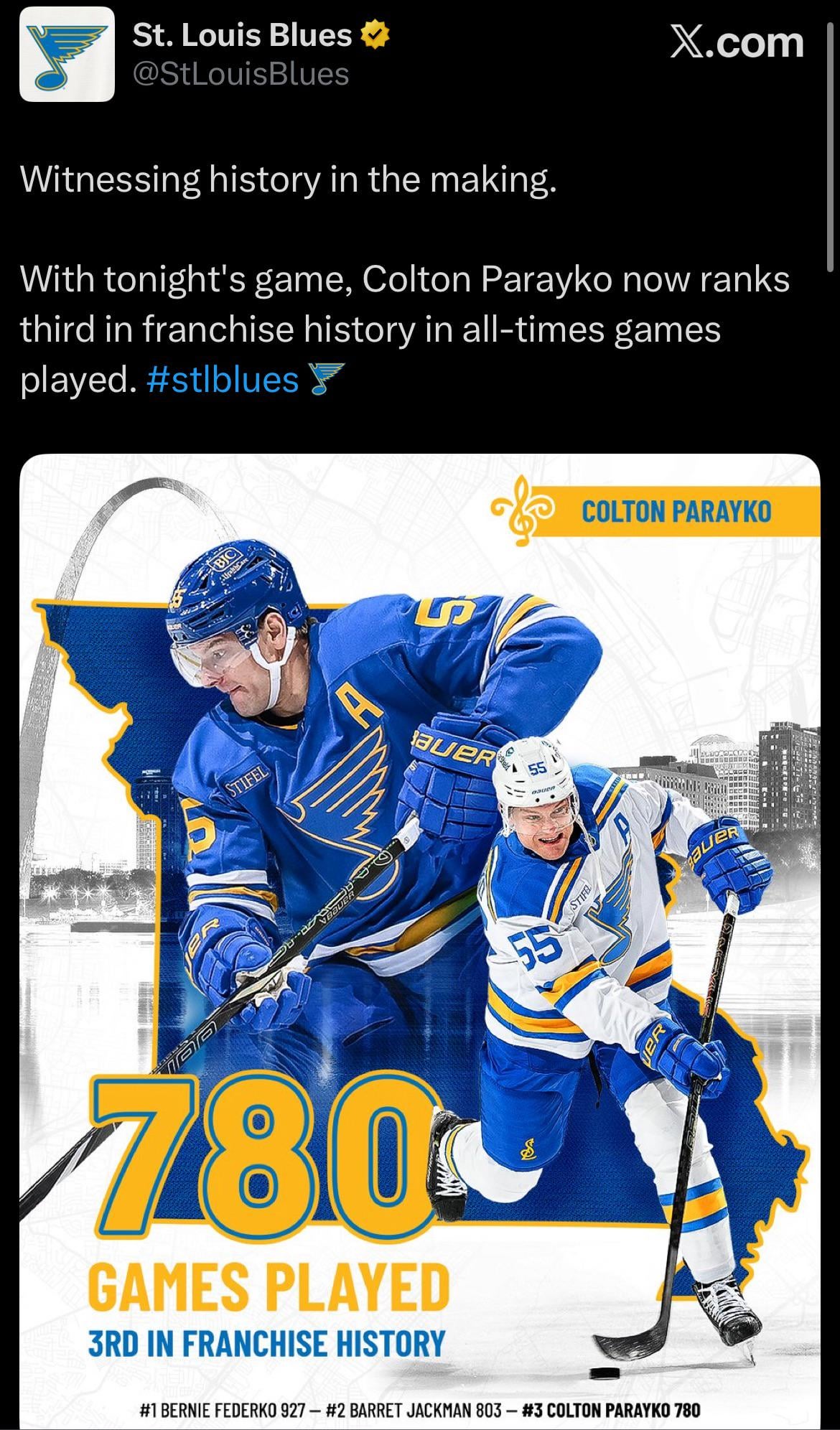 [Blues] With tonight’s game played, Colton Parayko now stands alone in 3rd place for most games played with the franchise (780). He’s only behind Federko (927) and Jackman (803).