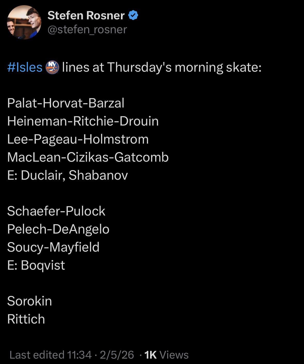 Drouin is fast becoming the Anthony Volpe of the Isles. I saw him live Monday and recall at least 2 chances he had to get a decent shot off and did nothing. Ritchie and Duke had good chemistry before Cal missed a few games. Don’t know why you don’t keep that going and let Drouin watch a game.