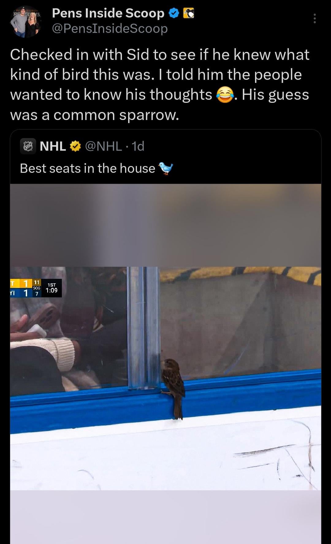 Sidney Crosby’s guess on the bird at the Islanders game 11 comments Lmao it *is* a House sparrow, which tbf is super common. Our boy knows bird The journalism we need in the world 🐧 Theyre invasive jerks but he knows more than the announcers Sid looking at the bird  Ugh, not excited enough. It might be a common house sparrow, but it’s still a bird. If you were a penguin what else would you do in your spare time? You have to memorize the habits and patterns of your sworn enemies. Why do I love the fact that Sid has bird watching as his hobby so much? I wanna see Sid’s Lifers list on eBird. Everyone was penciling him in as a coach post-career. But he’s gonna become a birdwatcher and shock everyone. He should be referenced as Renowned Bird Watcher Sidney Crosby, RBW Sidney Crosby for short. Get Sam Darnold on this Leave a ReplyYou must be logged in to post a comment.
