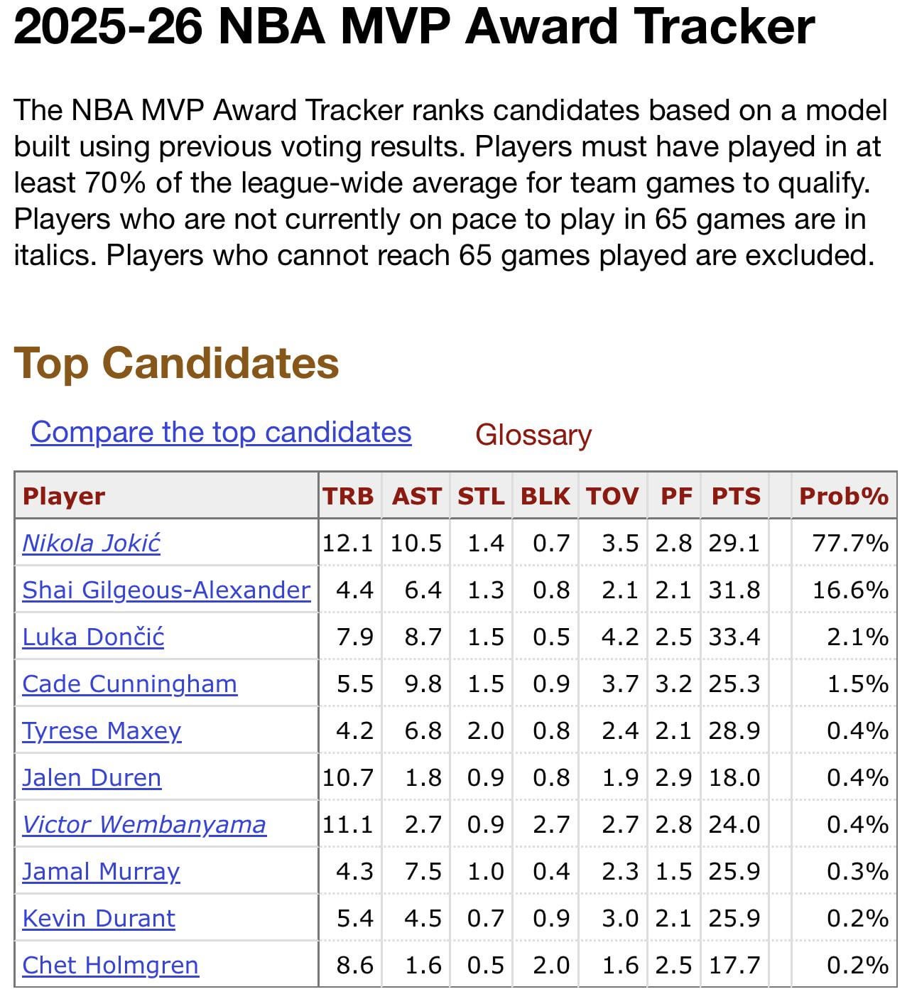 Jokić is Officially back on the BBref MVP Tracker, with a 77% chance to win if he plays enough games