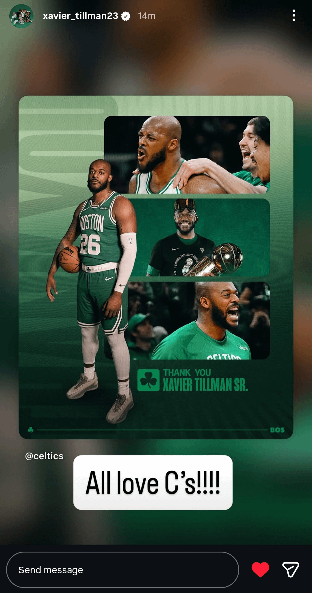 [Xavier Tillman] All Love C’s!!! 14 comments Ugh my heart 🥹 We’ll always have this: [https://www.youtube.com/shorts/xUzcLuspJnM](https://www.youtube.com/shorts/xUzcLuspJnM) Seems like one of the sweetest guys ever. I wish him the best! The three pointer gets the love (deservedly so!) … but we don’t win that game without him being able to switch onto Luka and Kyrie Was put on an island a bunch of times and stopped them damn near every time Will always be remembered … The biggest Celtic game of the decade he played a big part in securing the title Who know what happens in that series if it goes 2-1 I hope someday when he retires, he’ll come back here as part of the Coaching Staff. Love you too X! Honestly glad for him, hope he can break the rotation wherever he goes. Eh preciate you X Always been a team player and appreciate him being a locker room vibes guy during his time here Never forget when [our bench went crazy](https://youtu.be/wBFlruyOjcs?si=uRwJlNR4QWWEx5-E) when he hit that 3 during the finals his 3 pointer in game 3 is when we all knew , we fucking did it. Glad we got you a ring!! I’m gonna miss him, such a good vibes guy even if wasn’t always on the court. Game 3 will always be remembered 🫡 Might order his jersey, haven’t decided yet. I don’t get jerseys for end of rotation guys but might make an exception for X. NBA Champion Xavier Tillman NBA Champ! He’ll always have that important corner 3 on Game 3 of the Finals. Leave a ReplyYou must be logged in to post a comment.