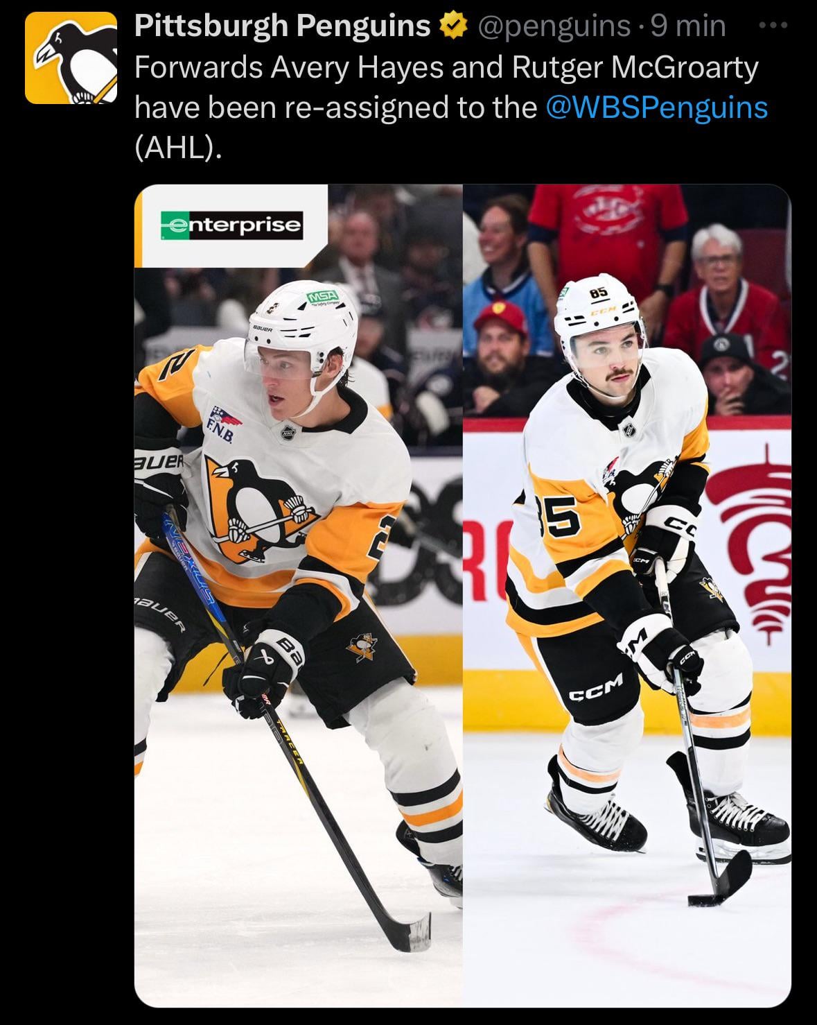 [Penguins] Forwards Avery Hayes and Rutger McGroarty have been re-assigned to the WBS Penguins (AHL).