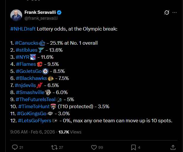 [Seravalli] Lottery odds, at the Olympic break:1. Canucks – 25.1% at No. 1 overall 2. Blues – 13.6% 3. NYR – 11.6% 4. Flames – 9.5% 5. Jets – 8.5% 6. Blackhawks – 7.5% 7. Devils – 6.5% 8. Nashville – 6.0% 9. Sharks – 5% 10. Florida (T10 protected) – 3.5% 11. Kings – 3.0%